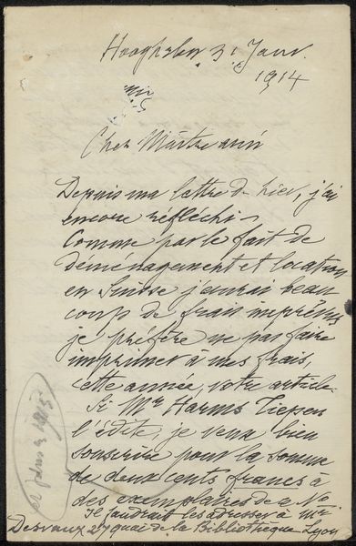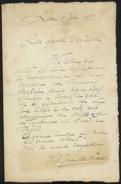 Editor: This is Johan Thomas Lundbye's "En lilje, der vokser op af et løg (stiliseret). Hertil vers. Side 3," created sometime between 1840 and 1844, using watercolor, pen, and textile on paper. It seems to be a page from a sketchbook or journal, filled with writing and a delicate botanical illustration. What is striking is the intimacy of the piece. What do you notice? Curator: It's fascinating to consider this drawing within the context of the Danish Golden Age. Lundbye, along with other artists, was deeply engaged in exploring national identity and Romantic ideals. This intimate page, with its delicate lily and accompanying verse, becomes a window into the cultural values of the time. How does the inclusion of text alongside the botanical illustration affect your reading of the work? Editor: It almost feels like a personal reflection. Like he was marrying his artistic and poetic sensibilities. It gives a sense of this being about more than just observation of nature. Curator: Precisely. Think about the Romantic movement's emphasis on emotion, individualism, and the power of nature. Lundbye’s choice to combine the visual with the written invites us to consider how the artwork contributes to a larger cultural dialogue, particularly about nature's role in shaping national identity and individual experience during a period of significant social and political change. Editor: So, it’s less about pure botanical illustration and more about weaving nature into the fabric of Danish culture? Curator: Exactly. By juxtaposing the stylized lily with the handwritten text, Lundbye participates in the construction of a shared cultural understanding. It shows that artworks are made not in a vacuum but as part of greater historical discourses. Considering these connections allows for a deeper appreciation. Editor: I see what you mean. This conversation has helped me realize the crucial role context plays in understanding and interpreting a work of art. Curator: And I've found it insightful to see how fresh eyes respond to this piece in our current social landscape.