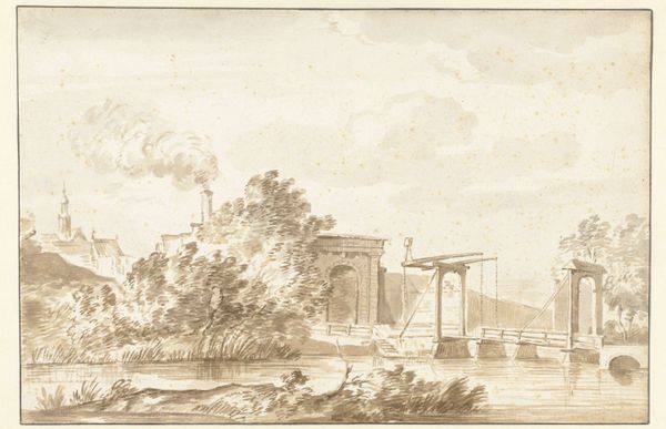 Curator: Here we have Philip James De Loutherbourg’s "The Resolution Steam-Engine, Coalbrookdale, Seen from the New Pool," currently held in the Tate Collections. Editor: It has such a delicate, almost dreamlike quality for a depiction of industry. The sepia tones lend a nostalgic air. Curator: Indeed. Coalbrookdale was at the forefront of the Industrial Revolution. De Loutherbourg, though, frames the steam engine amidst the natural landscape. Editor: What I find fascinating is how the artist chooses to portray this machine. It looks less like a symbol of progress and more like another element within the existing ecosystem. Curator: Certainly, the composition seems to soften the impact of industrialization, perhaps reflecting the complex attitudes of the time. The image serves as a document of the shift, a visual negotiation between nature and technology. Editor: Agreed, there’s a tension here. It makes one think about the human labor and materials required to construct both the engine and the scene before us. Curator: It’s a poignant glimpse into a transformative moment in British history. Editor: Yes, and how artistic representation shaped public perception of that shift.