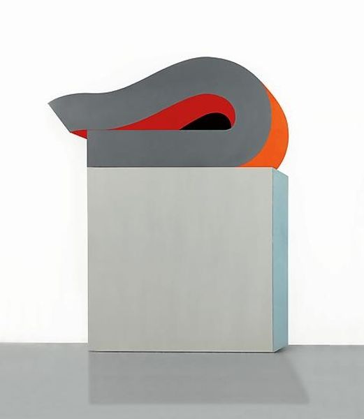 Sven Lukin made this Untitled sculpture out of painted wood, but we don't know when. The shapes are pretty simple, almost cartoonish, but they're layered in a way that feels very architectural. I think about it as a painter, looking at the way the colors meet, and it seems to be really about the surface, and the edges of that surface. The way the blue meets the pink in that big swoosh on the front is like a conversation between two characters. The paint looks thick, almost matte, and I wonder what it feels like to touch. This object embraces ambiguity, I think. Is it a model for a building? A kid’s toy? It's one of those forms that suggests the conversation never ends, a bit like the work of Elizabeth Murray.
