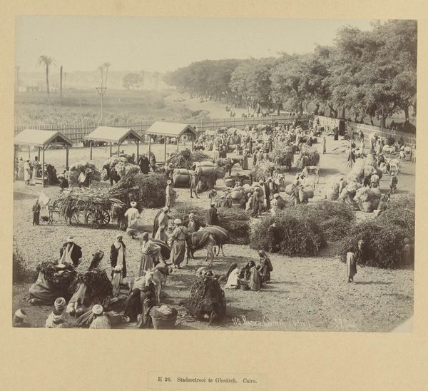 Curator: What a compelling image! There's an almost dizzying effect from all the radial sunshades that break up the negative space of the scene. Editor: It's called "Pasar in Bukittinggi," a monochrome photograph, sometime between 1891 and 1912 by Christiaan Benjamin Nieuwenhuis. Currently, it resides here at the Rijksmuseum. To me, it captures a frenetic energy, a feeling of lively exchange that I find rather appealing. Curator: Absolutely. Nieuwenhuis documents what appears to be a thriving marketplace, likely central to the local economy. One can almost imagine the networks and labour supporting this central locale of trade. The parasols, undoubtedly locally made, suggest ingenuity with materials that would’ve been accessible in the late nineteenth, early twentieth century. Editor: Observe how he employs depth of field; the foreground appears sharper, almost gritty, before fading into the densely populated market under the tree. Also, the composition—the low horizon line, allowing for the large tree to occupy much of the upper portion—adds to its depth and, oddly enough, its balance. Curator: True, this work presents an opportunity to consider how such images functioned within the context of colonial-era trade and representation. These ethnographic photographs shaped perceptions of local populations. Consider the conditions under which this photo was commissioned or sold and its relation to local labour and industry. Editor: I do concede there's something romanticizing and possibly even exotifying at play. And yet, that overwhelming canopy, echoed in the repetition of the sunshades—the monochrome unifies this incredibly busy composition into a distinct harmony. It’s as much about form as it is about the marketplace, surely. Curator: Maybe Nieuwenhuis' intention was aesthetic and commercial, but the very act of creating this image also engaged with and transformed the scene and our view. The labour involved in maintaining the market, as well as that to set up the photographic equipment, offers rich areas of investigation. Editor: Yes, but what a beautifully realized scene, with its range of tones and textures all in monochrome. So let’s take this opportunity to see the beautiful interplay between process and artistry, the formal composition, the implied narrative and the impact of colonial dynamics, as we ponder “Pasar in Bukittinggi.” Curator: I'd agree this photograph grants insight into artistic value but also sheds light on economic relations between people and nations, on production and consumption in that era.