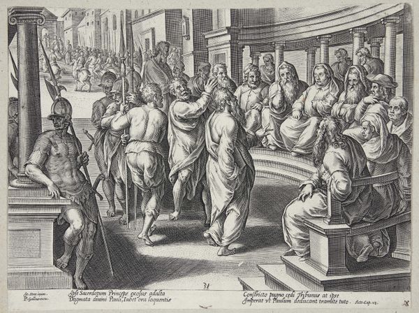 Editor: This print, "Paulus voor het Sanhedrin" by Claes Jansz. Visscher, dates from somewhere between 1643 and 1646. It’s currently housed in the Rijksmuseum. It seems to depict a biblical scene, with a lot of figures densely packed into the composition. How do you interpret this work? Curator: This print offers a fascinating lens through which to view the socio-political dynamics of 17th-century Holland. Consider the historical context: the Dutch Golden Age, a period marked by intense religious and political debate. The artist chose to depict Paul before the Sanhedrin, a scene fraught with tension and the potential for conflict between religious authority and individual conscience. Notice how Visscher uses line and composition. What strikes you about the staging of this scene? Editor: The architecture seems very staged, theatrical almost, with the Roman soldiers flanking one side, acting like guards on stage. And the robes of the figures on the right...everyone is crowded, but carefully placed. Curator: Exactly. That theatricality is no accident. These prints were not merely illustrations; they were often deployed as powerful tools in shaping public opinion. Consider the target audience. Who might be drawn to an image of a righteous individual standing up to religious authority? What does this suggest about the prevailing social attitudes towards power and religious dogma during the Dutch Golden Age? The printing press was THE social media back then! Editor: It's interesting to think about how a print like this could contribute to larger cultural conversations around religious freedom and political resistance, how its distribution might affect people's viewpoints at the time... Thank you! Curator: Precisely. It underscores the vital role of art in shaping collective memory and reinforcing specific ideological positions. I am walking away with a reinforced understanding about how art intersects with politics and faith, it has been valuable.