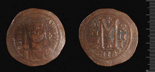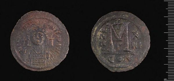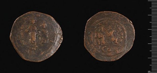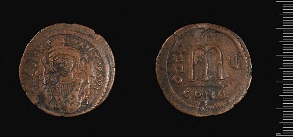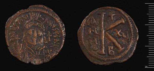 Editor: This is a coin made by Justin II, currently held at the Harvard Art Museums. It’s quite small, but the details are fascinating. What strikes you about its visual composition? Curator: The most compelling element is the duality embedded within its design. Note the stark contrast between the figural representation and the abstract lettering, signifying the intersection of power and symbolic language. Editor: So, it's almost like two different worlds pressed together on a single surface? Curator: Precisely. One could interpret the coin as a microcosm, reflecting the Emperor’s attempt to integrate both tangible authority and symbolic representation within a unified visual statement. Editor: I see, the coin serves as a formal synthesis of power and language. Thanks for illuminating that. Curator: It is in observing these formal relationships, the interplay between line, form and space, that one truly deciphers the coin's intended message.