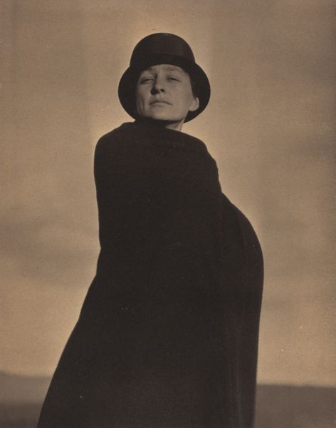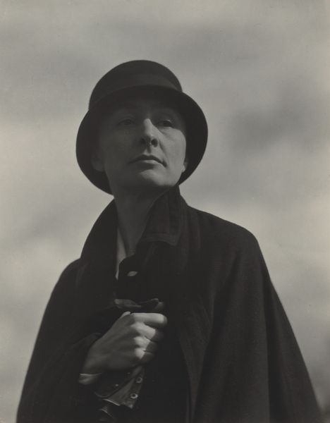 This is a photograph of Georgia O'Keeffe, by Alfred Stieglitz. Notice how Stieglitz uses a monochrome palette to sculpt O'Keeffe's figure out of light and shadow. Stieglitz's composition is meticulously arranged. The strong vertical lines of O’Keeffe’s top hat and coat contrast with the soft, blurred background. Her face is the focal point, framed by the stark geometry of the hat and the flowing lines of her hands. The hands, almost floating, introduce a dynamic element, their delicate form juxtaposed against the solid dark masses of her clothing. This photograph challenges conventional portraiture. Stieglitz captures O’Keeffe not merely as a subject, but as a complex interplay of form and emotion. He uses her figure to explore ideas about artistic identity, gender, and the creative process. The interplay between light and shadow creates a psychological depth, inviting viewers to contemplate the multifaceted nature of O'Keeffe’s persona, which opens up endless possibilities for interpretation.