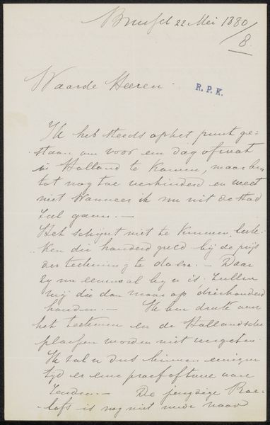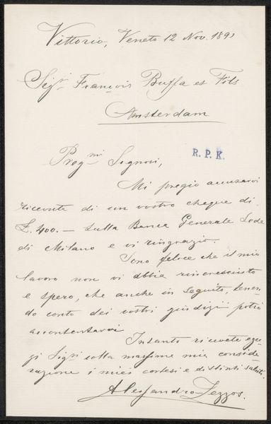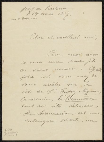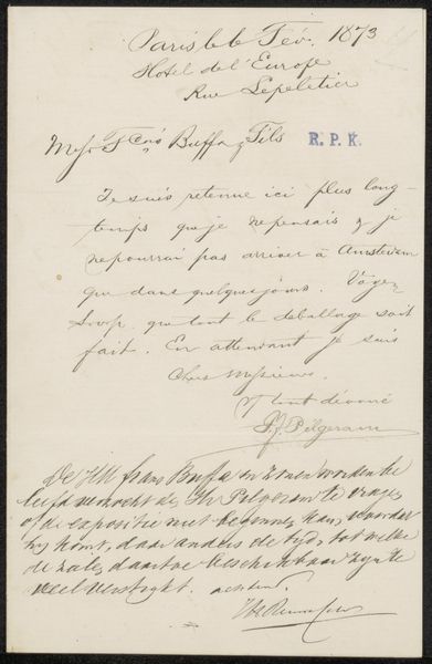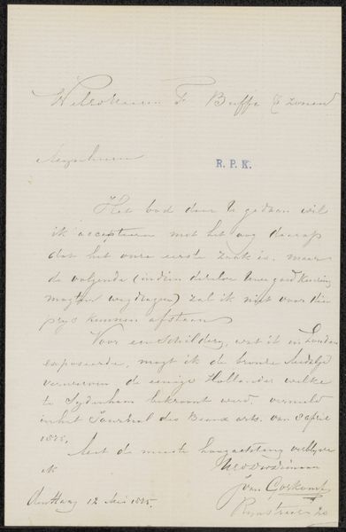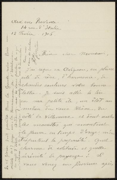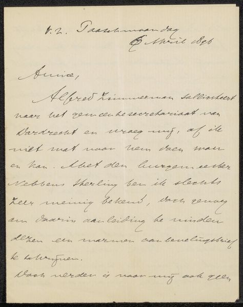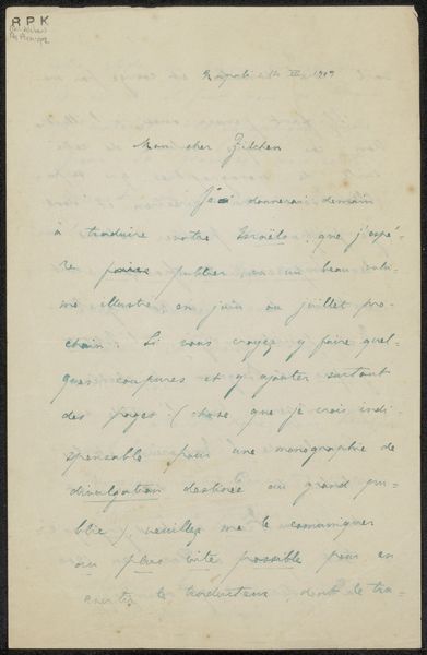 This is a letter, "Brief aan Pieter Haverkorn van Rijsewijk," crafted by Elbert Jan van Wisselingh in 1912. Its aesthetic lies in the stark contrast between the pale, textured paper and the dark, looping script. The formal elements of line, space, and texture intersect to create a fascinating composition. The hand-written text, rendered in delicate strokes, fills the page in a seemingly organized yet organic manner. This interplay creates visual tension that destabilizes our expectations of conventional communication. The linear arrangement of the words against the textured backdrop of the paper constructs a field of signs which invite interpretation. Ultimately, the letter exists not just as a message but as an artifact, revealing how elements of form function within the cultural practice of communication. Its structure reflects an inherent tension between clarity and complexity. Art, therefore, is in a constant state of flux.