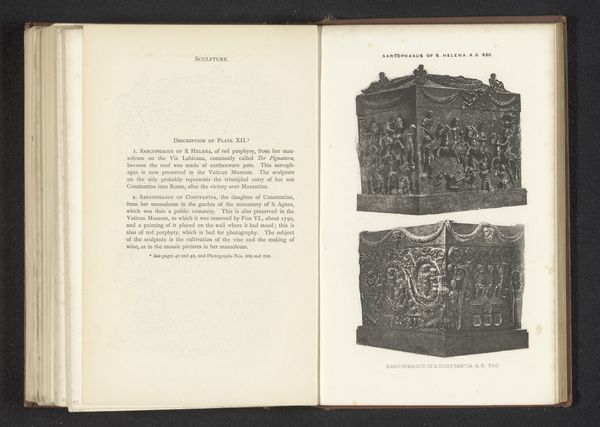 Curator: We’re looking at a photograph of a page from what appears to be an archaeological record, featuring "Three Reliefs with Religious Depictions," dating from before 1868. The image shows collotype prints of what look like engraved reliefs. What stands out to you about this composition? Editor: Well, the prints themselves appear to be documenting something older and possibly eroded, I’d guess the source reliefs were important religious items. They feel both monumental and fragile. What does this photograph, acting as a document, tell us? Curator: This photograph doesn't just show us the reliefs, it shows us a specific mode of interacting with them. We need to consider the production and the reproduction of these images as a form of knowledge. Who was commissioning these collotypes, and for what purpose? How does the act of printing and disseminating these images affect their perceived value and authority? Editor: That’s an interesting way to look at it. So, the *reproduction* of these objects transforms them? Curator: Precisely. Think about the labor involved in each stage - quarrying the stone for the original reliefs, engraving, photographing, collotype printing, and binding the final publication. Each step involves different skill sets and socio-economic conditions, contributing layers of meaning to the final artifact. It also shifts these items across cultures, creating a new market for these ‘historical objects’. Does the print serve the religious function, or simply document that such items are created? Editor: I never really thought about how all those processes add meaning. Now I am curious what it means to produce these photographs documenting the engravings rather than exhibiting the original reliefs, especially in terms of making Asian Art visible within Western European society. Curator: Exactly! It's about understanding art as a product of complex material and social forces. Now we're looking beyond just the 'religious depiction', to understanding the networks of production that allow us to see it at all. Editor: So, by looking at the medium, the method, we are not only observing the object, but examining a kind of early global economy. Thank you!