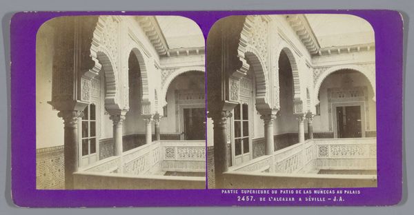 Editor: This stereoscopic photograph, "Gezicht op de Patio de las Muñecas en de Salón de Embajadores in het Alcazar in Sevilla" by Jean Andrieu, dated between 1862 and 1876, presents this intricate architecture in such detail. It feels like looking into a dollhouse, or maybe a stage set, something unreal. What captures your attention most about this image? Curator: What's immediately striking is how this photograph presents Islamic architecture to a Western audience in the 19th century. Think about the role of photography at that time – it’s a tool for documentation, certainly, but also for shaping perceptions. Consider how Andrieu chooses to frame this space: is he emphasizing the "exotic" otherness of the Alcazar, or is there a respectful attempt to capture its beauty? How might this image have influenced the understanding, or misunderstanding, of Islamic art and culture in Europe? Editor: I hadn't considered that aspect. I was more focused on the purely visual – the receding arches and geometric patterns. But now that you mention it, the way it’s presented does seem… curated for a specific gaze. Curator: Exactly! And that gaze isn't neutral. Photography in this era participated in colonial projects by visually "possessing" and categorizing the world. It's interesting to consider the power dynamics at play, who gets to look, and what narratives are being constructed through these images. Editor: So, even a seemingly objective image like this is embedded within a particular social and political context? It makes me wonder about the other ways the Alcazar was represented and consumed by Europeans at the time. Curator: Precisely. It serves as a reminder that art and visual culture aren't isolated entities; they are actively shaping, and being shaped by, the world around them. Considering that public role that this photography plays is important in how we approach and try to learn from its impact. Editor: This has given me a whole new perspective on how to interpret photographs of historical architecture! Curator: Glad to hear it, questioning how imagery functions politically and socially allows one to see the past in richer depth.