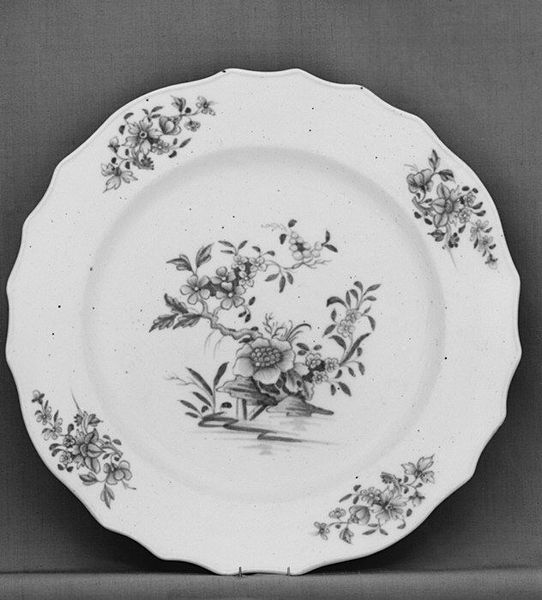 Curator: We're looking at a Tournai porcelain plate from 1765 to 1780, currently residing at the Metropolitan Museum of Art. It exemplifies decorative art of the Rococo period. Editor: It whispers springtime in an almost shy voice. A delicate, almost ephemeral scene unfolds on a pristine canvas. Curator: Indeed. The form itself is noteworthy; observe the undulating rim, textured to suggest the delicate veining of leaves. Its formal qualities present a fascinating interplay between texture and line. Editor: That's right. The rim feels like a gentle echo of flower petals. The central motif is floral and delicate, offset from the porcelain texture with such refinement... It has an enchanting softness. Curator: Semiotically, the floral arrangement connotes themes of ephemerality, nature’s beauty, and perhaps even the transience of life, typical of Rococo sensibilities. The limited colour palette—perhaps cobalt oxide—reinforces the visual subtlety, inviting closer inspection and contemplation. Editor: You know, the asymmetry in how the flowers are grouped actually amplifies that "naturalness," almost a stylized snapshot. It's art mimicking life, but with a heightened grace. The way they balance lightness with those grounded stems – poetry in porcelain. Curator: Precisely. The formal asymmetry serves not as imbalance, but rather to guide the viewer’s eye. The central floral arrangement operates as a visual anchor, and from a structuralist perspective, these flowers also establish the piece’s intended symbolism: it transcends simple utility. Editor: And you start to wonder, you know? Was this on some royal table, catching light from crystal chandeliers? Did it bear the weight of some marzipan swan at a ridiculously lavish party? Or was it someone’s pride and joy on a quiet mantlepiece? So much untold history! Curator: Its provenance hints at elite patronage and demonstrates how these decorative objects played a key role in creating cultured environments during this time. It makes tangible the social structures. Editor: Standing here now, I can't help feeling time both compresses and expands. It's lovely to consider beauty and intentional artistry designed for everyday utility, like this plate. Curator: Absolutely, an apt final thought.