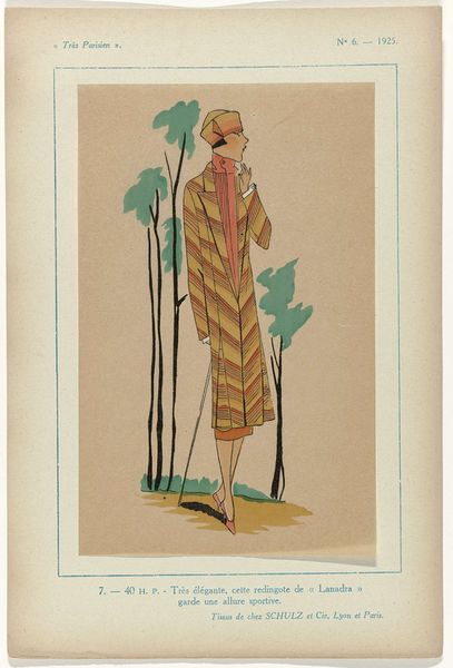 Editor: This watercolor drawing titled "Très Parisien, 1925, No. 1, Pl. 6: - PROMENADE" by G-P. Joumard immediately gives me a sense of 1920s fashion and Parisian chic. The figure almost appears as a caricature with exaggerated features, walking in an equally stylized scene. How do you interpret this piece within its historical context? Curator: That's a great initial reading! I see it as a fascinating snapshot of the societal forces shaping the “new woman” image in post-World War I France. Mass media like fashion plates became increasingly influential in disseminating ideals of modernity. Do you notice anything in the woman’s dress or demeanor that suggests this modernity? Editor: Well, she looks quite self-assured, and her clothing is definitely modern. I mean, it has quite a distinct, stylish silhouette. Curator: Exactly. Her slim figure, short skirt hemline, and somewhat androgynous silhouette signaled a rejection of older, more restrictive codes. Also, the fact it appeared as part of a fashion magazine plate reinforces the commercialization of this image. It aimed not just to represent, but to *sell* this version of Parisian modernity. Were women really dressing like this on the street? How do you imagine this impacted female identity in 1920's Paris? Editor: I imagine there was pressure to conform to these ideals, but also perhaps excitement and a feeling of liberation from old expectations. Curator: Precisely. It represents a tension between aspirational imagery and the everyday lives of women – a push and pull in identity that art and media were central to at this time. Editor: I never considered how such an image in that type of mass publication could shape such a narrative and place women in that specific social context. Thank you for broadening my perspective! Curator: Likewise; your initial take on the stylization of the drawing has brought more depth into its construction.