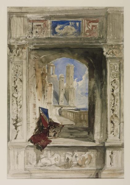 Curator: Bosboom's "Sint-Jorispoort in het Doelengebouw te Hoorn," likely completed sometime between 1827 and 1891, offers us a glimpse into a past that feels both distant and somehow very present. Editor: It's such a melancholic scene, isn't it? The muted tones, the weathered stone… it all speaks of time's passage, and a quiet kind of perseverance. Curator: Exactly. Think about the context: The Sint-Jorispoort was once part of a civic guard building. Its imagery would have represented protection and community power in Hoorn. We must consider the historical tensions and class divisions of 19th-century Netherlands. Editor: The gateway itself functions as a potent symbol. Notice the family entering—they carry a sense of everyday life continuing amidst the monumental architecture of the past. Curator: And the use of watercolor is crucial. Bosboom's loose brushstrokes capture the texture of the weathered stone. Watercolor served many artists in his era as an immediate medium that offered visual insight, without requiring huge investments in time or production. It opens up to the conversation regarding accessibility, labor, and time investment in the production of art in the late 1800s. Editor: Those colors really lend themselves to exploring deeper meaning! Think of the subdued palette evoking a kind of stoicism. It almost feels like a collective memory, passed down through generations within that community. Curator: Precisely, and from an intersectional perspective, consider the women depicted and how public space served differently various members of this historical society. Bosboom provides social context as an artifact worthy of conversation. Editor: Ultimately, the St. George Gate transcends a simple landscape portrayal to resonate at the symbolic level as part of our visual archive. It has so much to tell those who wish to view it! Curator: Indeed. Bosboom presents both the permanence of architecture and the transience of human existence—forcing the viewer to reconsider her position relative to a rich layered past.