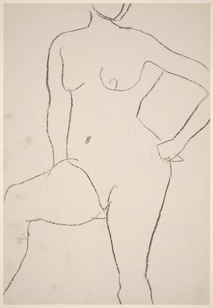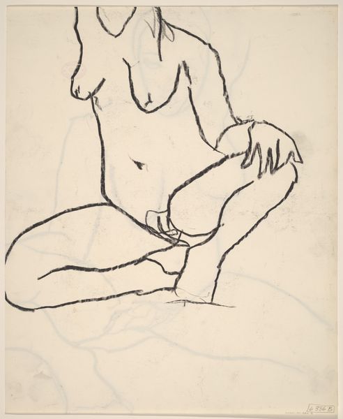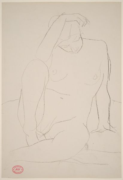 Curator: This is an untitled pencil drawing by Richard Diebenkorn, created sometime between 1955 and 1967. It features a seated female nude with her left arm raised. Editor: It’s so minimal. Just a few strokes, but they powerfully suggest the weight and form of the figure. There’s a definite vulnerability, yet also a poised confidence to the way she sits. Curator: Diebenkorn was really interested in exploring the possibilities of line and form through simple materials like pencil and paper. What’s fascinating here is how much he conveys with so little – the play of light, the contours of the body, the very essence of the pose. The economy of mark-making emphasizes process. It feels immediate and unpretentious. Editor: Right, the lack of detail is striking. The face is almost totally blank, and the lines are loose and sketchy, nothing feels fixed. Given when it was made, the drawing sits against the highly sexualized female form dominating pop culture at that moment. It is such a departure from images found, for example, in Playboy magazine, first published in 1953. The anonymity suggests, perhaps, less objectification. Curator: That's interesting, to view it through the socio-cultural lens of its time. In terms of process, the choice of such humble materials – just pencil on paper – forces us to consider the role of the artist’s hand. No complex technologies, just skill and intent. It pushes the question: where does value truly reside in art making? Editor: Absolutely. And those kinds of economic, formal decisions are so central to how artists either resist or play into broader systems of art making and spectatorship. For today's audience, this artwork could serve as an excellent way to begin or enrich the viewing of figure drawings, and to have an informed conversation around art production and accessibility. Curator: Agreed. Diebenkorn invites us to consider how form can carry meaning, challenging viewers to reflect on artistic skill. Editor: Indeed, leaving me to ponder what makes art valuable.