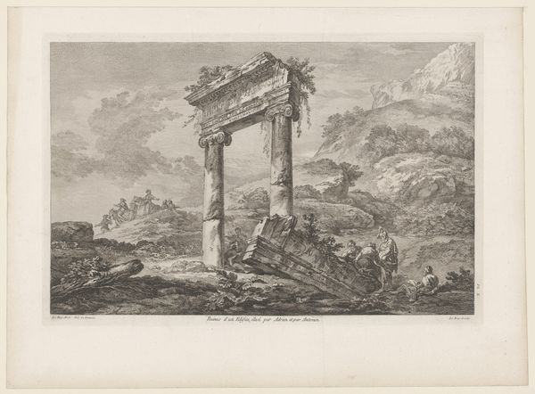 Curator: Looking at Henri Mauperché's etching from somewhere between 1612 and 1686, titled "Tobias toont Rafaël de vis in een landschap met ruïnes" I’m struck by its serene melancholy. Editor: Ruïnes... such powerful signifiers. This fallen architecture whispers of forgotten empires, doesn’t it? Juxtaposed with that idyllic landscape... it feels profoundly elegiac. Curator: Exactly! And note the delicate precision of the etching itself. The meticulous lines capturing the light on the crumbling stone, the feathery texture of the trees… it's exquisite! Mauperché masterfully plays with light and shadow, creating depth and atmosphere. Editor: That landscape… so typically Baroque, idealized and yet…slightly ominous? This episode with Tobias, remember he’s healing his father’s blindness using the fish’s gall bladder! A strange kind of folklore morality tale unfolding against such civilized decay. I also notice how the composition directs our gaze into the distance – the viewer feels propelled into this space where reality and legend blend so intriguingly. Curator: It does pull you in, doesn't it? Mauperché’s Baroque landscape almost invites a symbolic reading, where the crumbling ruins remind us that time spares nothing. Not empires, not even the seemingly solid structures of our beliefs. It reminds me of similar works of that era: powerful commentary with religious undertones! Editor: Religious but also, so classically secular! Baroque artists seemed to have a foot in both worlds: religious morality, and ancient history – it feels like cultural memory being reshaped as something totally new. The river of time is forever flowing, and Mauperché captured its very essence with this scene. Curator: And this specific moment too, really adds so much more. Thank you, as always, for enlightening my perspective. Editor: And thank you, these ruins continue to be potent images that still affect how we imagine the weight of time today.