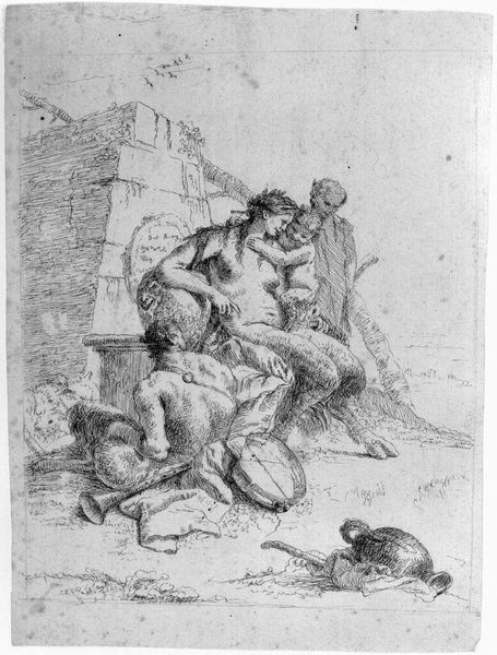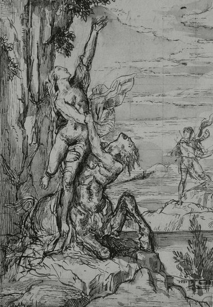 Here we see an anonymous drawing titled "Apollo Mourning the Dead Coronis," rendering the tragic scene from Greek mythology in ink. The story of Apollo and Coronis is laced with themes of love, betrayal, and divine retribution. Apollo, the god of light and music, falls in love with Coronis, a mortal woman. While pregnant with Apollo's child, Coronis falls in love with a mortal man. Upon hearing of her infidelity, Apollo, in a fit of rage, kills her. Overcome with remorse, Apollo attempts to save their unborn child, Asclepius, by performing a divine caesarean. Here, the artist captures a moment of intense grief and regret. Apollo bends over Coronis, whose lifeless body is sprawled on the ground. The stark composition and emotional charge invite us to consider the consequences of unchecked anger and the complexities of divine-mortal relationships. The artist leaves us to reflect on how power imbalances, gender roles, and moral judgments shape these ancient stories and continue to resonate today.