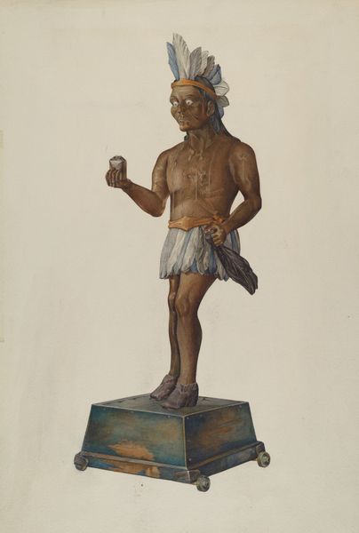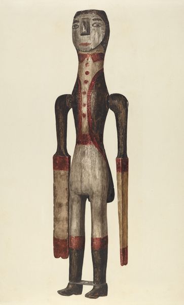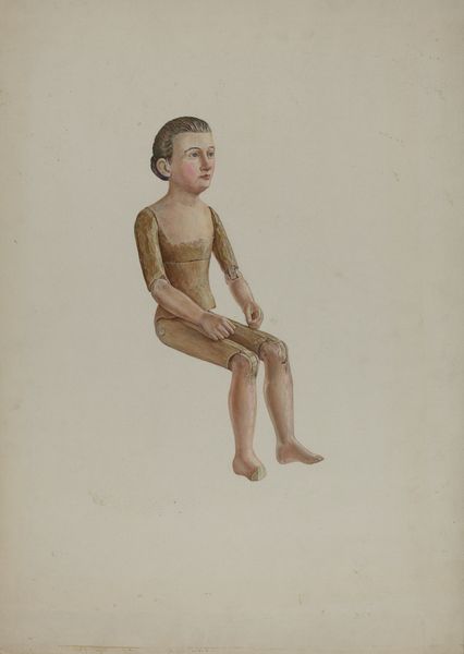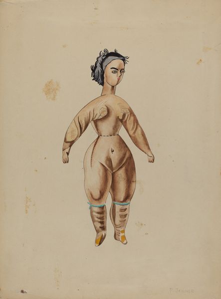 Curator: "Leather Bodied Doll," rendered around 1936, seemingly with watercolors. Jane Iverson is the artist. It has a haunting simplicity. Editor: Immediately, I'm struck by the vulnerability it exudes. It reminds me of discarded childhoods, echoing themes of neglect and perhaps even trauma—particularly the empty stare and uneven stitching. Curator: It certainly possesses an unsettling presence, doesn't it? Notice how Iverson captured the texture of the worn leather and fabric. Dolls often function as repositories for projected emotions. Here, there’s almost an iconographic quality, a somber figure imbued with layers of unspoken meaning. Editor: Right, I agree about the projection. Dolls were frequently stand-ins for the marginalized, their physical imperfections mirrored the emotional baggage carried by children and even the makers of the dolls, who were quite often adults dealing with adversity themselves during this time period. Curator: The simplicity of the colour palette adds to that starkness. The off-whites, browns, and subtle pinks render a figure almost drained of life, yet there’s a undeniable resilience suggested in the upright posture, however faded it may be. The eyes are small, but not without some expressive presence. Editor: That resilience feels loaded. Given its folk-art style and date, I see echoes of the Depression era, where handcrafted toys embodied both economic hardship and fierce maternal dedication. The doll is literally pieced together; it's symbolic of societal fragmentation and individual attempts at wholeness, even within constrained means. Curator: Do you think, the slight asymmetry in its limbs is not merely an artistic quirk, but a symbolic rendering of inner imbalance? A material reflection of the psyche in pictorial form? Editor: Exactly. That imperfection carries weight. It highlights how societal forces impact even the most intimate spheres of life. Dolls aren’t neutral objects; they are mirrors, reflecting—and often distorting—social realities. It is a really thoughtful commentary by Iverson here, through a child’s doll. Curator: Indeed, there’s more than initially meets the eye with this piece. Editor: Agreed. The "Leather Bodied Doll" provides a rather chilling commentary on resilience, the weight of lived experience, and the echoes of forgotten narratives.