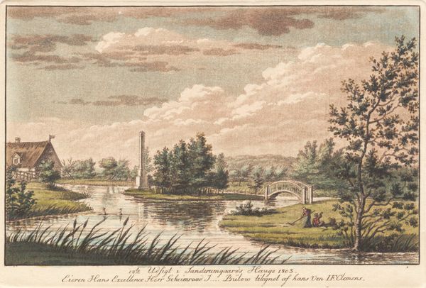 Curator: Ah, here we have "Sanderumgaards have 9," an aquatint from 1803 by J.F. Clemens, housed at the SMK. What strikes you first? Editor: Immediately, the delicate layering of colour and the almost obsessive details in the tree line and water reflection. You can tell Clemens poured himself into crafting this particular view. I wonder what techniques were used here? Curator: Indeed. Aquatint, as you might know, is a printmaking method using acid to create tonal effects. Here, it’s masterfully combined with watercolor washes, almost giving the work the atmospheric haze of a watercolour painting.. Editor: Speaking of that landscape—the placement of the obelisk is quite prominent, situated within nature. This composition hints to me the artist is trying to show how landowners can "frame" a picture in an aesthetic display of their properties for societal benefit, through production, not through consumption. Curator: A somewhat cynical outlook. I like that! However, I would propose instead, that it's an appreciation of nature, and reflection. Think about the romantic ideals of the time. Nature, sublime and powerful, and humans attempt to coexist within it in balance. This isn’t a raw wilderness; it’s been tamed, reshaped, not to exploit but to contemplate. Editor: Fair point! There’s that lone figure strolling across the lawn in the distance. Clearly the "haves" taking possession of the land by creating the landscape that gives value back to themselves in multiple material levels, and perhaps not in some high and holy place. How convenient that the landscape design allows them to leisurely inspect all aspects of "production." Curator: You’ve really zeroed in on the practical aspects, while I’m off pondering Clemens' intentions. But perhaps that’s the magic of art—seeing something new in the everyday. Editor: I think in some ways both. Thanks to Clemens and to the landscape engineers. I'd be remiss if I didn't give credit for this picture. Both, together. And also thanks to aquatint print for keeping copies flowing through generations and borders.