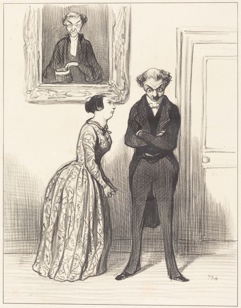 Editor: This is Honoré Daumier's lithograph, "Ayant la prétention de faire partie du beau monde," created in 1847. It’s such a sharp and critical observation of society. What strikes me most is the exaggerated portrayal of the figures; there is an almost cruel humor embedded here. How do you interpret this work? Curator: Cruel humor indeed! I see a delicious skewering of social pretension. It is a slice of Parisian life viewed through Daumier’s remarkably observant – and judgmental, I'll admit – eyes. That title is pure gold. But let's dig deeper. What do you notice about the way he renders these characters physically? Editor: Well, their features are definitely… accentuated. Almost to the point of caricature. Like the woman’s impossibly long neck, or the man’s overly formal stance. Curator: Exactly. Daumier uses distortion to reveal what he sees as their inner failings. They’re striving so hard to appear elegant, but he captures their awkwardness, their desperation, in these subtle exaggerations. He seems to be saying their attempts at sophistication are nothing more than a performance, a kind of tragicomedy, don't you think? It also makes you think, what 'performances' do we take part in everyday, in hopes of fitting in? Editor: I see what you mean. So it’s not just a portrait of individuals, but a commentary on an entire social class, struggling for status. A real burn! Curator: A burn indeed! One of many he inflicted with his art. Editor: This really reframes how I look at satirical art. It’s more than just funny drawings; it can be profound social commentary. Curator: Precisely! Art as a mirror – sometimes a funhouse mirror – reflecting society’s quirks and foibles.