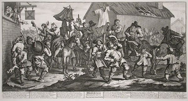 William Hogarth created this etching, "Hudibras and the Skimmington," using metal plates to transfer his design onto paper. The etching process itself involves considerable physical and chemical labor. A metal plate, likely copper, is coated with a waxy substance, and then the design is drawn, exposing the metal. Immersed in acid, the exposed lines are eaten away. The plate is then inked, and the surface wiped clean, leaving ink only in the etched lines. Finally, heavy pressure is applied to transfer the image to paper. Hogarth's choice of printmaking allowed for mass production, making his art accessible to a broad audience. The scene, a "skimmington ride," depicts a shaming ritual aimed at those accused of domestic misbehavior. Hogarth’s sharp lines capture the energy of the crowd, their expressions of mockery, and the social dynamics of the time. Understanding the work involved in the production of prints, and the social function they served, gives us a richer understanding of Hogarth's art. It bridges the gap between fine art and the wider world of social commentary, labor, and everyday life.