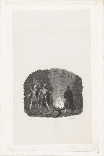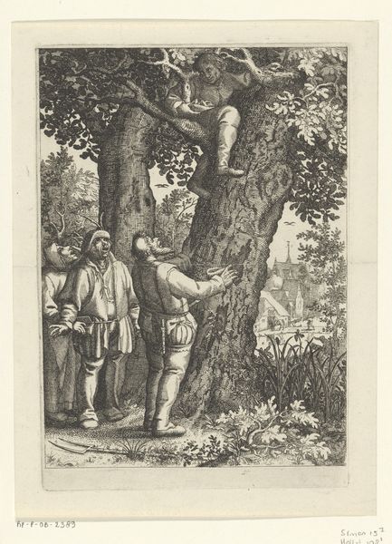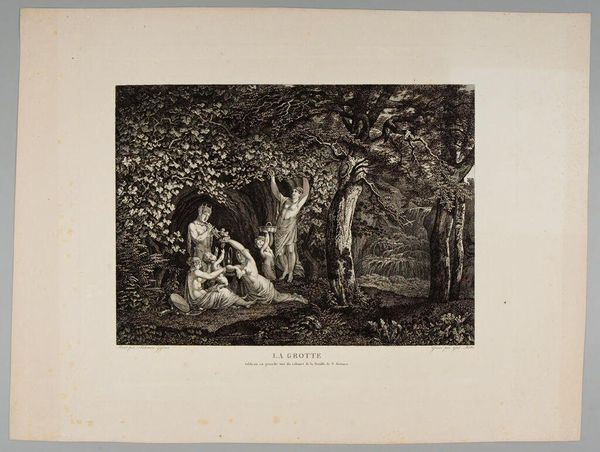 Reinier Vinkeles created this print, Nachtgezicht met figuren met een geldzak, sometime before his death in 1816. Notice how the composition is structured around the contrast between the dark, dense forest and the small group of figures illuminated by the moon. Vinkeles masterfully uses light and shadow to create a sense of drama and mystery. The forest, rendered with intricate lines, looms over the figures, suggesting an environment that is both natural and full of potential danger. The figures themselves are gathered around what appears to be a bag of money. The arrangement creates a focal point that invites speculation. Who are these people? What is the significance of the money? The scene could be understood through semiotics, where the forest acts as a signifier for the unknown, and the money bag is a symbol laden with cultural meanings of wealth, greed, or perhaps necessity. This artwork thus not only captures a scene but also sparks narratives and questions, inviting viewers to decode its intricate visual language.