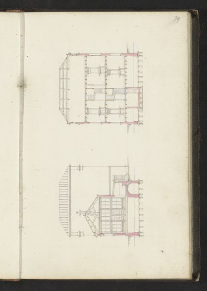 Curator: What a fascinating drawing! This is Willem Springer Jr.'s "Doorsnede van een gebouw over de breedte," or "Cross-section of a building across its width," created around 1864. It’s a detailed rendering in pencil on paper. Editor: Immediately, I'm struck by its stark, almost clinical quality. The precision of the lines, the carefully delineated planes… it feels very rational, very structured. Curator: It’s an architectural drawing, after all. But look beyond the strict geometry. Springer isn't just showing us the beams and arches. Consider, instead, how the architectural space itself becomes a container for cultural memory. Editor: I see the faint blush of pink accentuating some of the structural elements. It's subtle, almost like an afterthought. I’d be curious about the rationale behind the restrained chromatic code here. It doesn’t feel fully representational. Curator: Perhaps that gentle colour served as a cue, triggering emotional responses beyond mere functional design. It's a hint of the building's lived experience, wouldn’t you say? This hints at a Victorian fascination with the symbolic role of buildings, public and domestic, shaping a citizen's identity, values, and ideals through the architectural structures that house them. Editor: The lack of inhabitants is striking. This isn’t a portrait of lived-in space. We see form and line rather than function; it gives it an almost dreamlike, abstract character. Curator: Agreed. That absence invites projection, perhaps allowing viewers, both then and now, to populate it with their own histories and meanings. An architectural space only fully breathes and means through what’s lived within. This shows how symbols evolve across time and use. Editor: Yes, though perhaps that invites over-interpretation? To focus solely on what is signified is to neglect what exists formally – the texture of the line, the interplay of negative space, the relationship between volume and plane. Curator: An argument that speaks to a universal challenge when interpreting any historical artifact! Editor: Precisely. Studying how art represents the objective and material world yields as much understanding as the consideration of what the symbol represents to cultures across eras. Curator: Indeed, and thank you for making such a relevant contribution! Editor: Thank you! This dialogue reminds us that art, even in its most representational forms, offers multiple readings through different lenses.