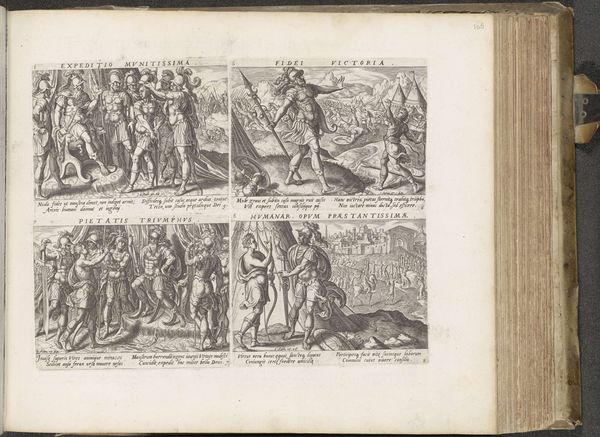 Curator: This engraving from the late 16th to mid-17th century, credited to Johann Sadeler I, depicts four narrative scenes related to Saul and David. It's currently held at the Rijksmuseum. Editor: The sheer detail of the engraving is striking. What I’m really curious about is how prints like these circulated and were consumed at the time. What do you think, seeing as this is more than a simple illustration, but an entire page, perhaps part of a book? Curator: That's the crucial question. Looking at this, it's impossible to ignore the material conditions of its creation and reception. These engravings weren't meant to be isolated artworks, were they? Editor: Precisely. It was meant to be part of something larger... Curator: How might the narrative, biblical in theme, relate to socio-political concerns? Consider this book as a commodity, aimed at specific demographics. Were these readily available or more of a luxury item? Editor: Considering the period, with its religious wars and social stratification, perhaps this book offered moral lessons on power and humility for wealthy families with enough access to afford them. Is it that Sadeler uses an earlier source for these engravings, essentially becoming a craftsman repurposing images. The Baroque style might reflect an intended message or moral for the ruling classes, and therefore served as propaganda? Curator: The materiality of this engraving, then, serves as evidence. It embodies not just religious allegory, but also complex relations between artists, patrons, and audiences within the very economic fabric of that era. And the medium, being reproducible, grants it a different social power compared to singular artworks like painting or sculpture. This impacts consumption... Interesting, no? Editor: Absolutely! It reframes my understanding. It makes you consider it’s no longer about individual authorship or aesthetics, but instead, who was really driving its production and the bigger social role these books played. I find that the material conditions of this object shape its purpose to its culture!