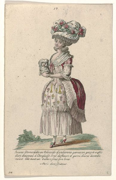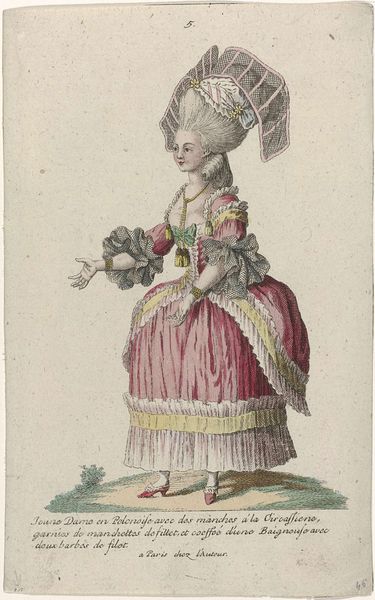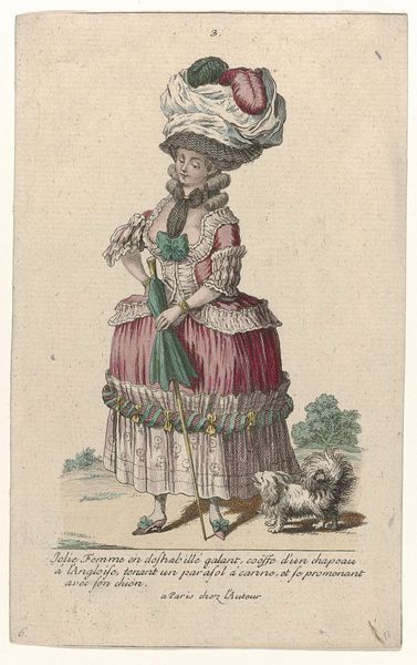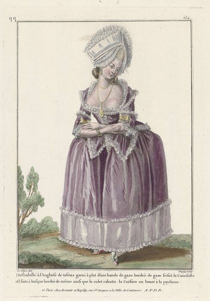 Curator: Here we have "Gallerie des Modes et Costumes Français", dating from around 1785. This particular piece, rendered as an engraving, presents a fashionably dressed young lady. What catches your eye first about this work? Editor: Well, undeniably, the towering hairstyle commands immediate attention! The composition seems to almost build upwards from the small shoes to this elaborate confection atop her head. The colors are muted but balanced, providing a strangely appealing aesthetic, given the excesses it depicts. Curator: Indeed. And note the context: these fashion plates were commodities. They were circulated among the wealthy to dictate style, employing teams of engravers, colorists, and printers. The subject isn't just an image, it's a node in a network of consumption. Editor: I'm more interested in the details themselves, actually. Look at the precise lines used to delineate the fabric's texture and the subtle gradations in color achieved through hatching. It shows masterful technique for a relatively utilitarian object. Consider the contrast between the flowing skirt and the rigidity of her torso created by that unforgiving corset! Curator: Certainly. But it also presents a fascinating example of material culture shaping identity. Each detail-- the "Austrasian" sleeves, the Peruvian-inspired overskirt -- signals social status and geographical awareness within a culture obsessed with surfaces and novelty. Fashion became a signifier for those seeking status, a way to broadcast one's allegiances. Editor: That may be, but the careful balance achieved through compositional techniques—the placement of the figure relative to the framing of the background trees—speak to me. Even the restrained color palette elevates it beyond simple cataloging; it is aesthetically resolved. The skill in its visual language cannot be ignored! Curator: Perhaps so, but for me, its value lies in what it reveals about labor and aspiration in pre-revolutionary France. The layers of artifice literally embody social stratification! Editor: I suppose we've both found a bit of intrigue here, just by looking closely and asking our different kinds of questions. Curator: Absolutely. An image intended to project status ends up reflecting, quite unintentionally, the very structures it sought to uphold.