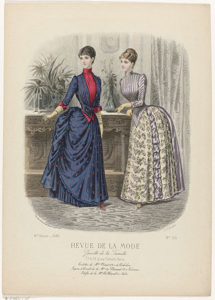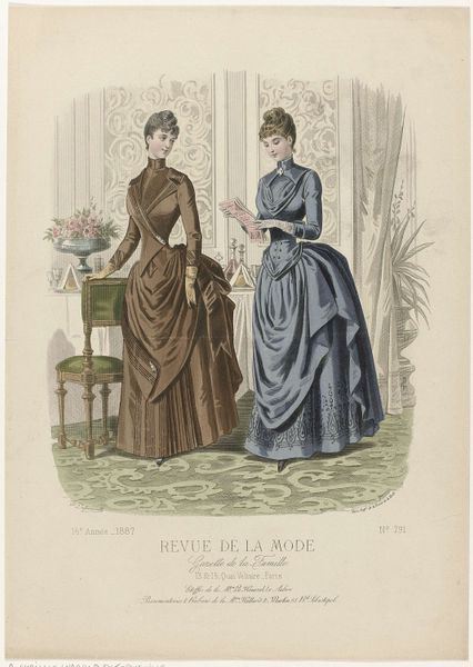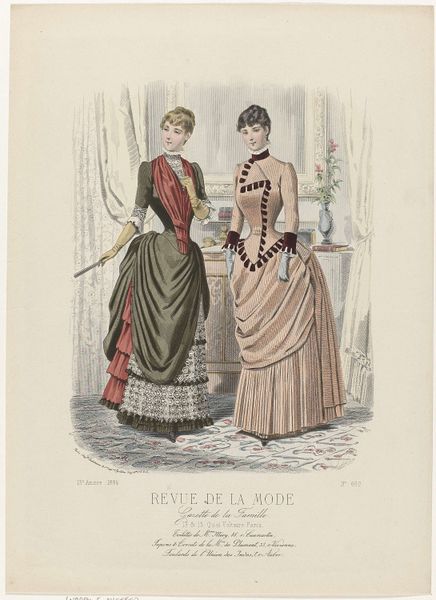 Editor: Here we have an illustration from 'Revue de la Mode, Gazette de la Famille,' dated January 13, 1884, by A. Chaillot. It seems to be a watercolor print depicting two women in fashionable dresses. I'm struck by the intricate detail and the way the composition emphasizes the textures of the fabrics. What aspects of this piece particularly grab your attention? Curator: It’s a fascinating example of late 19th-century fashion illustration, certainly. Notice how the artist meticulously renders the draping and layering of each garment. Consider the visual tension created by the contrast between the ornate detailing of the dresses and the relatively sparse background. The artist deliberately places the figures, cropping the composition. What effect does this have on your interpretation? Editor: I guess it brings my focus entirely to the garments, as the background details are very minimal. Curator: Precisely. Observe also the line quality – how thin and precise it is, particularly in delineating the lace and trimmings. Note also the subdued color palette, almost pastel. It softens the overall effect. Do you find the work harmonious? Editor: It does feel balanced, perhaps because the muted colors create unity despite the complexity of the designs. Curator: Indeed. The harmonious balance suggests a deliberate attempt to present an idealized vision of contemporary fashion. It’s a showcase of form and technique, with each element contributing to a unified aesthetic experience. I find that quite engaging, considering the image’s original commercial intent. Editor: This makes me look at the illustration with a fresh perspective. It’s not just about the dresses but about the artist's conscious design choices and attention to structure, balance, and color to create an ideal and pleasing image. Curator: Exactly, we are appreciating how these aesthetic choices transcend the work beyond its original purpose of selling dresses, providing a lens to gaze at form, color, and texture.
