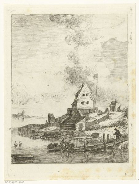 Curator: This print, currently held in the Rijksmuseum collection, is titled "Dorp met kerktoren aan het water," which translates to "Village with church tower by the water," and it’s attributed to Piet Schipperus, created sometime between 1850 and 1929. As you can see, it’s an etching. Editor: Ah, it feels very Dutch somehow! It evokes a sense of quiet contemplation, doesn’t it? A stillness, only broken by the potential splash of those dark, looming birds in the sky, swirling around the gothic tower’s spire like my anxieties when I miss my morning coffee. Curator: Well, that moodiness is, I think, intimately connected to the medium itself. Etching, a printmaking technique, demands precision. The artist carefully uses acid to bite into the metal plate. It’s fascinating to think about the process, isn't it? From the selection of the plate and acids to the application of the ground and, ultimately, to how all that impacts the finished visual statement. Editor: It absolutely makes sense, because I look at it and it really resonates on some subconscious level. I love how it captures the reflections in the water... such an evocative, melancholic scene. It’s like a frozen memory. A captured essence of time in a place. Curator: Yes! The contrast between light and shadow really accentuates a key social component in landscapes and cityscapes— the built environment. It is such an honest way to bring an older building and traditional living space to modern eyes. Editor: Exactly. Well, thinking of it now... it’s a landscape rendered in lines of faith and water. What a nice picture to make you appreciate where you came from. Curator: Yes. Understanding the intersection of place, people, and processes deepens my appreciation as well.