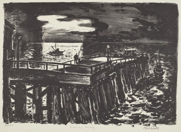 Curator: This print, titled "Surf Casters," was created by Dayton Brandfield sometime between 1935 and 1939 using pencil and other drawing media. Editor: It’s a compelling scene—sort of bleak and powerful. The figures battling the surf…there’s an almost heroic feel, despite the understated medium. It brings to mind issues of labor and leisure amidst the social realities of the time. Curator: I agree, the scene depicts more than leisure; it underscores the physical act of labor, evident in the positioning of the figures in contrast to the overwhelming ocean waves. This print makes me curious about Brandfield’s own connection to manual work and the production processes evident within the composition, which he chose to render using pencil techniques, highlighting accessible and cost-effective methods, resonating with economic realities. Editor: Precisely! And given the period, we cannot ignore the backdrop of the Great Depression. These weren't just guys relaxing; it’s possible that fishing was supplementing their diets or even providing an income. There’s a raw, unvarnished quality that hints at class and economic struggle. Who were these men? What were their lives like beyond this snapshot? Also, the use of realism invites a critical look at the depiction of the male form. Is it idealized, or does it attempt to reflect the everyday realities of working-class bodies? Curator: Absolutely. Looking closely, you notice Brandfield focused considerable attention on capturing the play of light across the water. The artist masterfully used various drawing techniques to add textures which give life to the water currents and the figures struggling against them, while the subtle use of pencils seems appropriate with Brandfield's choice of material speaking to broader implications around resourcefulness and constraints within creative practice during this era. Editor: This also leads to how accessibility to recreation differs across gender and class lines, as we consider these representations in their social environment. Was Brandfield aiming to make a commentary, or merely capturing his own time, place, and lived experience as honestly as possible? I want to know whose perspectives went unnoticed back then! Curator: Good point! Seeing how his work stimulates such dialogue gives the print a life far exceeding the mere image. Editor: Right! Art becomes meaningful only through conversations that acknowledge not just brushstrokes, but broader societal concerns, don't you think?
