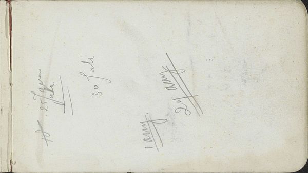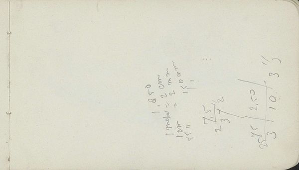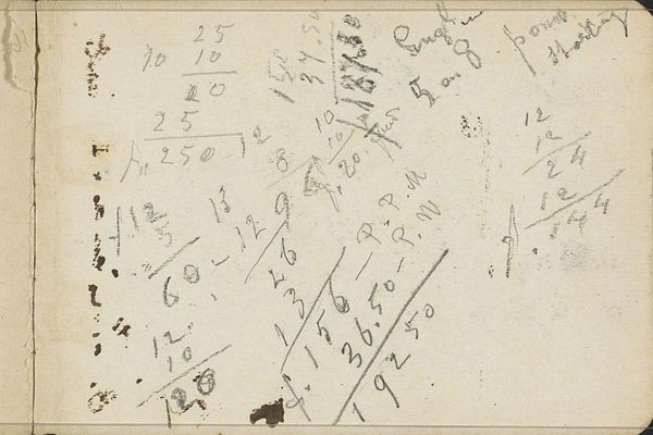 Editor: This intriguing work, "Berekeningen," or "Calculations," rendered in ink on paper by Carel Adolph Lion Cachet between 1905 and 1906, now resides in the Rijksmuseum. My initial reaction is one of curiosity; it resembles a page torn from a mathematician’s notebook. How do you approach interpreting such an abstract piece? Curator: It's crucial to remember that Cachet wasn't merely scribbling random numbers. Early 20th-century art, including work such as this drawing, frequently responded to the anxieties of rapid industrialization and social change. The act of calculation, usually hidden behind the scenes, takes on a physical form, suggesting something of a modern crisis concerning quantification. What kind of statements are being made through it's stark simplicity? Editor: So, it's less about the mathematics itself, and more about the concept of calculation becoming a subject worthy of artistic attention? Curator: Precisely. Art was democratizing in subject, moving away from established subject matter, portraying daily life. One way to read this image is an example of how abstraction, even something seemingly dry as numbers, can express the underlying structures shaping our social world and everyday interactions. Editor: That shifts my perspective completely! I was focusing on the individual page, rather than what that process may stand for more broadly. Curator: Think about the institutional context, too. How might the Rijksmuseum's decision to display "Berekeningen" reflect changing ideas about what constitutes "art" and "historical value?" Editor: I see, placing value and providing institutional recognition. Thank you, I have learned a lot about how the socio-historical period plays a part. I would have completely overlooked all these layers. Curator: Indeed! By seeing beyond just the image itself, we uncover powerful narratives about societal values and power dynamics that inform its presence.