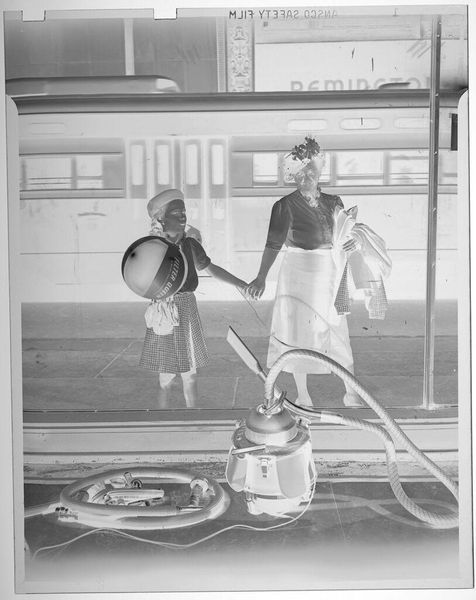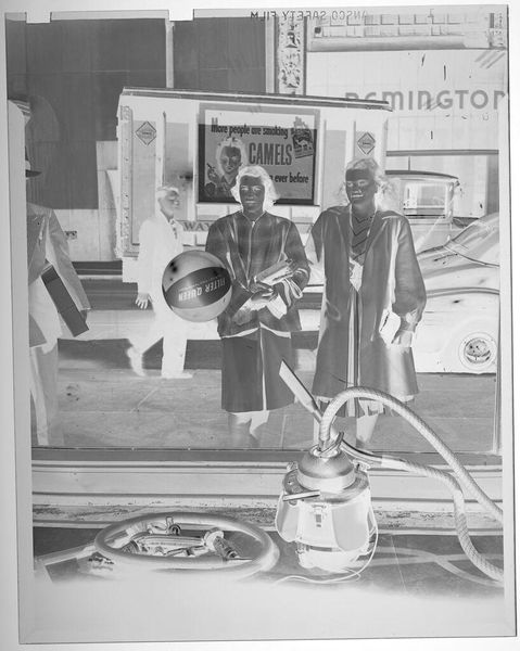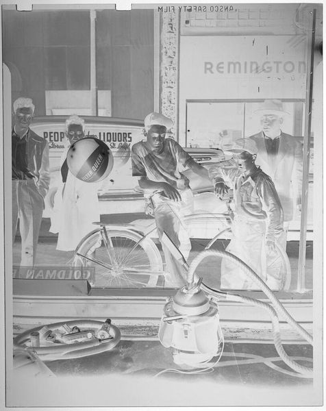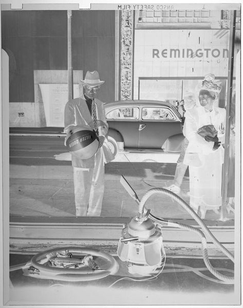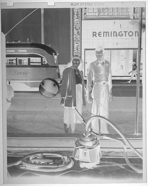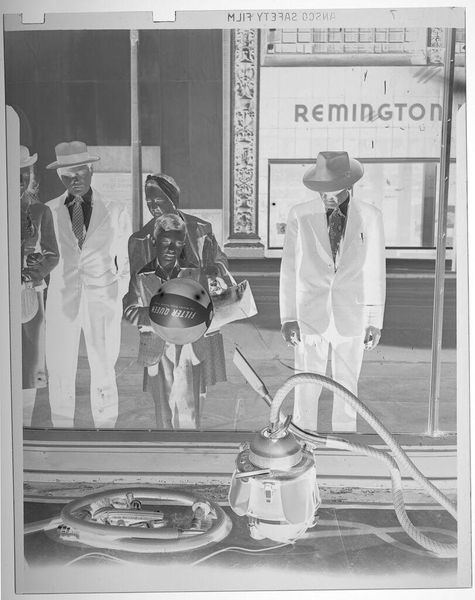 Curator: This arresting photograph, by Jack Gould, depicts men watching a vacuum cleaner demonstration through a shop window. Editor: It has a ghostly quality, doesn’t it? The high-key lighting almost flattens the forms, turning the figures into spectral observers. Curator: Indeed, the vacuum becomes a sort of idol, doesn’t it? A modern object of fascination and desire. The reflection adds a layer, suggesting how advertising can hold up a mirror to our aspirations. Editor: I'm drawn to the formal repetition; the circular form of the cleaner is echoed in the lighting fixture next to it. But the figures remain strangely detached, outside the frame, separated by glass. Curator: Perhaps Gould is exploring the very act of spectatorship, the way modern life positions us as observers of progress and consumption. The "Remington" sign in the window further underscores ideas around progress and aspiration. Editor: It leaves me pondering the nature of modernity and the quiet alienation it can engender. Curator: A haunting image that prompts us to consider the narratives we project onto everyday objects.
