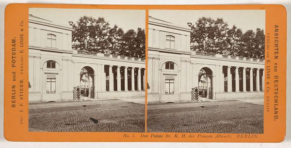 Curator: Gazing at this gelatin silver print, taken between 1868 and 1870 by Johann Friedrich Stiehm, one sees the imposing structure of the Atles Museum in Berlin, rendered in stark neoclassical grandeur. The rigorous arrangement of the columns, the severe geometry… it speaks of Enlightenment ideals, doesn't it? Editor: Yes, utterly imposing, like a temple guarding secrets. It's formal, but strangely stark. Bare trees and that cobbled square amplify a sense of… solemn emptiness, almost a premonition. Curator: Stiehm captures not merely the facade, but also an entire ideology materialized in stone. The columns aren't simply architectural supports; they are representative of civic virtue and order, echoes of antiquity meant to legitimize the modern state. Consider the technical choices – the stark lighting which emphasizes the mathematical precision. Editor: The light feels oppressive too, it enhances that temple-like quality you mentioned. But think about it - someone walking through that space, on those very cobbles! Was it bustling with intellect and art, or already feeling like a monument to times gone by? It makes you want to wander in. Curator: The print as a whole becomes a study in contrasts – the 'living' city space versus the ‘frozen’ monument. It encapsulates the ambivalence inherent in Neoclassicism. There's an order there, an insistence on reason over feeling… almost forced. Editor: And what secrets were held inside, back then, compared to now? Or, perhaps the greatest treasures are simply the shadows playing on those stern columns. It's almost a stage set! Curator: Indeed. A stage for ideas. And in its photographic rendering, Stiehm offers us not just a portrait of a building, but a critical discourse on its purpose. Editor: Exactly. So, it looks like what felt oppressive to me now turns out to suggest how cultural power looks through time, whether that is reason or any other construct of power in our society. Fascinating.