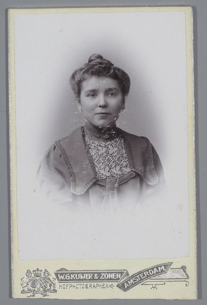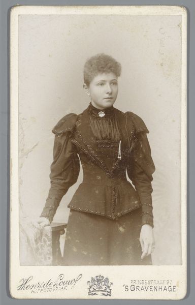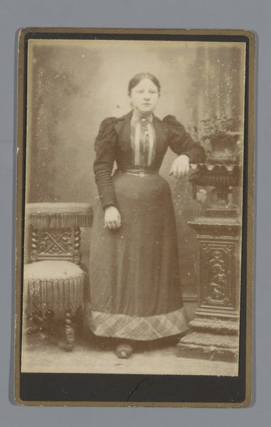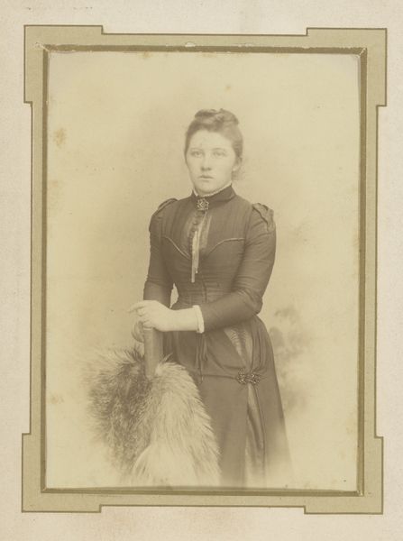 Curator: Here we have a portrait, a photographic print of an unknown young woman, created sometime between 1878 and 1886 by Louis Robert Werner. It's part of the Rijksmuseum collection. Editor: She looks quite solid, doesn't she? Framed almost severely. Her gaze is direct, her clothing seems warm and heavy... almost maternal, if I can risk such projection! Curator: Well, the weight you sense comes in part from the photographic technology of the era. The glass plate negatives demanded long exposures, which often resulted in formal, stiff poses. And indeed, that fur coat looks extremely warm and dense, almost sculptural. It must have been tremendously valuable as the result of someone else’s labor and her ability to purchase it. Editor: True, one can almost feel the hand of the maker in such a work. The backdrop, however, it's a painted one, no? Such stark contrast! The way the young woman posed feels artificial but necessary and functional given that time period. Did it take much time and workforce to generate photographs back in the 1870s-1880s? Curator: Considerably more. Each print would have involved the labor of preparing the glass plate, carefully posing the subject, a long exposure time, and then developing and printing the final image in the darkroom. So a simple portrait involved a considerable investment of both money and human time. This woman clearly invested time, resources and effort to portray herself for a reason. What do you think it could have been? Editor: To control her image. Perhaps even create a sense of permanence as photography began supplanting painting for simple records and portraiture of family and peers. The result feels like a time capsule: it’s the woman's presence. We only know her through these alchemic and artisanal choices in that exact place in time. This material object has her energy in it somehow... Curator: That’s a compelling way to put it. This particular image then serves as both an individual story and a window onto the societal and technological transformations of that era. Editor: A beautiful combination! I feel that I learned and saw so much more today from these pictures than reading any written document!