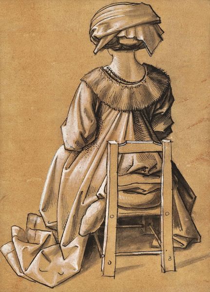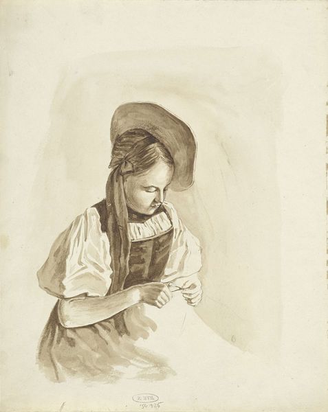 Here we see a pencil drawing by Pieter van Loon, titled 'Standing Woman with Basket, Seen from the Back'. The composition centres on a solitary figure, depicted from behind. Van Loon’s strategic use of line and shadow models her clothing and the basket, creating a gentle interplay of light and form. Notice how the folds of her dress and the texture of the basket are rendered through subtle variations in pencil pressure. This close attention to materiality provides depth and volume within the drawing's limited tonal range. The woman’s posture and the angle of her head suggest movement, implying a narrative that invites speculation about her destination and purpose. The semiotic elements in the artwork, such as the woman's traditional attire, engage with cultural codes reflective of the period. The drawing thus presents a quiet meditation on form, texture, and cultural identity, inviting viewers to find their own meaning within its simple, elegant structure.