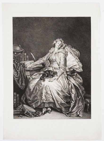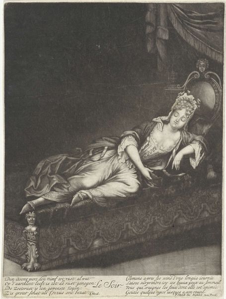 Pieter Schenk created this print of a young woman on a bed in Amsterdam, likely using a technique called mezzotint. This process involves roughening the entire plate, then selectively burnishing areas to create lighter tones. Look closely and you will see that the velvety blacks and smooth gradations are distinct from the crisp lines of an engraving. This tonal quality beautifully captures the luxurious textures of the woman's gown and the ornate bed. The choice of mezzotint is significant. It's a labor-intensive process, aligned with the culture of luxury depicted, reminding us of the hand skills that drove the fashion and furnishing trades. Although a print like this could be mechanically reproduced, the technique itself speaks of craft and careful labor. So, consider the time and skill involved in creating this image, reflecting the values of the society that produced and consumed it.