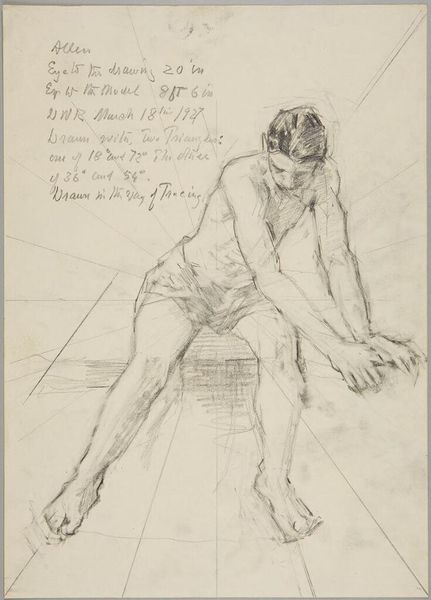 Editor: So, here we have Denman Waldo Ross's "Nude Study of Walter Nelson." It's a graphite drawing, roughly 11 x 8 inches. What jumps out at me is the underlying geometric grid. What do you make of it? Curator: The grid alludes to an idealized form, a system of proportion. The nude, a classical subject, is here interwoven with geometry, resonating with ancient Greek ideals of beauty and order, yet the soft rendering complicates this. How does this tension impact your understanding? Editor: It feels like a dialogue between the ideal and the real. I hadn't considered the classical element so directly. Curator: Exactly. Ross uses symbolic geometry to elevate the ordinary, a gesture of cultural memory. It encourages us to seek deeper meaning within the representational.