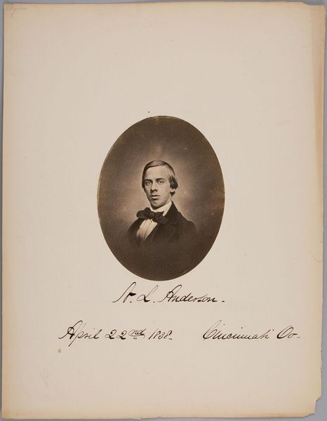 Editor: So, this is a portrait of William Gilchrist Gordon by John Adams Whipple. The image itself is dated November 14, 1856, and it's at the Harvard Art Museums. It’s quite striking, almost haunting in its simplicity. What do you see in this piece, beyond the formal portrait? Curator: Well, isn’t it interesting how the oval framing gives the image the feeling of a locket, holding a precious memory? I wonder what Gordon was like. Perhaps he was a dreamer, like many of us? The sepia tones lend a sense of melancholy, a wistful gaze back at a time long gone. Editor: I hadn’t thought about the locket comparison, that’s a great point! I was more focused on the somber mood. Curator: It’s all about layers, isn't it? The mood, the method, the memory... it’s a conversation across time. It makes me wonder about my own portrait, should someone choose to make one. Editor: Agreed! It's fascinating how a single image can spark so many questions.