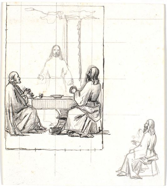 Curator: Right now, we're standing in front of "Maaltijd te Emmaüs," or "Meal at Emmaus," a pen and ink drawing from the late 18th or early 19th century, attributed to Anthonie van den Bos and housed here at the Rijksmuseum. Editor: The moment I saw this, I felt a hush. It's deceptively simple. Just a few lines, really, but the air of revelation... palpable. The subdued gray washes amplify the feeling. What am I seeing here? A sacred secret? Curator: It depicts the biblical scene where the resurrected Jesus reveals himself to two disciples during a meal in Emmaus. Historically, such scenes offered a sanctioned avenue to reflect on faith and the Church's role in interpreting the divine. Remember, representations, and even interpretations, were tightly controlled. Editor: You’re so right, it’s more than just ink on paper; it's access to belief in visual form. It almost feels like peering through a keyhole into a very private moment. I feel as if I shouldn't be watching, they should be enjoying a special reunion dinner with just themselves in the room, unbothered. I imagine that is part of the brilliance behind his choice of medium too: a line and wash are humble tools for an artist to render something so precious, divine. Curator: Absolutely. Also, the artist choosing to portray this specific episode indicates perhaps the rising individual relationship with religious themes that we observed during this time. Paintings and drawings, though still under the eye of institutions and commissions, allowed some measure of re-examination. Genre paintings grew more widely favored. Editor: I also admire the details. The simple table setting, the jug on the floor...they aren't embellished, there's something raw. Each character even looks a bit astonished by the happenings taking place within their party! Yet it has this feeling of comfort to it. Curator: That rawness could also signify a shift away from overly stylized depictions that we saw during the Baroque period that, in other pieces of art, perhaps, favored the elites. Simpler settings allowed more people to identify with it personally. Editor: This quiet drawing really speaks volumes, doesn't it? The use of light and shadow... I think it really evokes such a powerful narrative even now, as we stand here. The lines really are exquisite and that the setting isn't ostentatious feels all that much more poignant. It shows faith and belief at a humble ground level. Curator: Indeed. And, for me, it speaks of how the institutions, while seeking to maintain some measure of order, inadvertently contributed to art that could spark personal reflection during changing times. Editor: Right. Thanks, I guess it shows how we bring both our perspectives to create more layered views when examining the significance of the art.