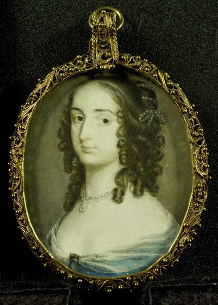 Jeremiah Theus painted this miniature portrait of Mrs. Jacob Motte, Rebecca Brewton, using watercolor on ivory. The oval format, enclosed in a gold frame, immediately presents a sense of containment and preciousness. The composition is dominated by soft, muted colors, with the blues of her dress and hair ribbon contrasting gently against the pale skin and background. The artist's delicate brushwork creates a smooth, almost porcelain-like texture, enhancing the sitter's idealized beauty. Theus has captured Rebecca Brewton with an emphasis on symmetry and balance, aligning with the conventions of portraiture during this period, yet this formal rigidity subtly undermines a more intimate and personal representation. This tension between formal constraint and individual expression invites us to consider how social codes of representation could both shape and be challenged by artistic skill. The very act of miniaturization alters how we consider scale and value.