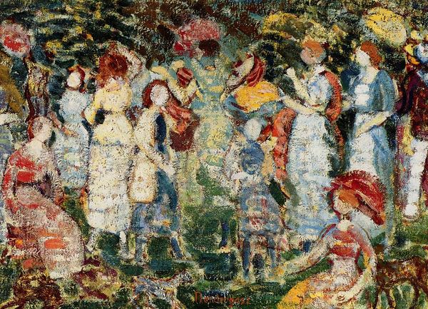 Adolphe Monticelli created "The Meeting of the Elegant Ladies" using oil paint, a traditional fine art material. The painting's surface is richly textured due to Monticelli's impasto technique. He applied thick layers of paint, creating a tactile quality that invites close inspection. This process allows the colors to blend optically, giving the scene a shimmering, almost dreamlike quality. Monticelli's process seems intuitive, built from layers of brushstrokes that build up the forms of the figures and the surrounding landscape. This mode of painting aligns with the 19th-century move toward personal expression and away from academic precision. It emphasizes the artist's hand and the immediacy of their gesture. Monticelli's distinct approach bridges the gap between traditional fine art and a more expressive, process-oriented approach. The very substance of the paint contributes to the artwork's atmosphere. It invites us to consider the labor and artistic decisions involved in the painting's creation. In this way it asks to think about fine art and craft as interconnected practices.