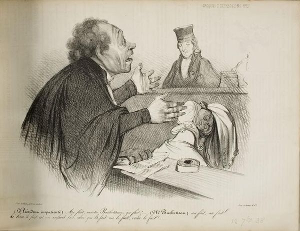 Editor: This lithograph by Honoré Daumier, created in 1846, is titled "Mr. Jean-Joseph-Chaboulard... first prize for good health!," plate 28 from Professeurs et Moutards. It's a humorous scene, but the lined detail of the printmaking gives it an industrious feel. What are your thoughts on the artwork, considering its creation process? Curator: Well, lithography itself is a fascinating material process. Daumier's skill transformed a relatively accessible print medium into pointed social commentary. Think about it: mass-produced prints distributing caricatures of the bourgeoisie. How does the widespread availability of such images shift power dynamics? Does it challenge notions of exclusivity in art and access to political critique? Editor: That makes me wonder about the intended audience and their access to such printed images. Were they meant for the middle class, making fun of themselves? Curator: Precisely! The production of such prints relies on both a market for them *and* a certain level of literacy. Daumier exposes societal norms through satire, using the very means of production available at the time, engaging in a dialogue with the culture of his time through labor and medium. Does the industrial process itself impact how the artist perceives the subject? Editor: I guess seeing it reproduced on a larger scale changes its purpose, or perhaps even enhances the original satirical point. This discussion makes me appreciate how closely tied the artwork's impact is to its production methods. Curator: Exactly. Considering Daumier's lithographs not just as art but as objects within a developing media landscape reveals a critical dimension of his commentary.