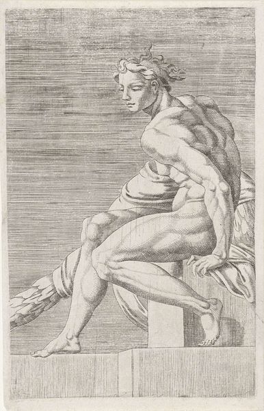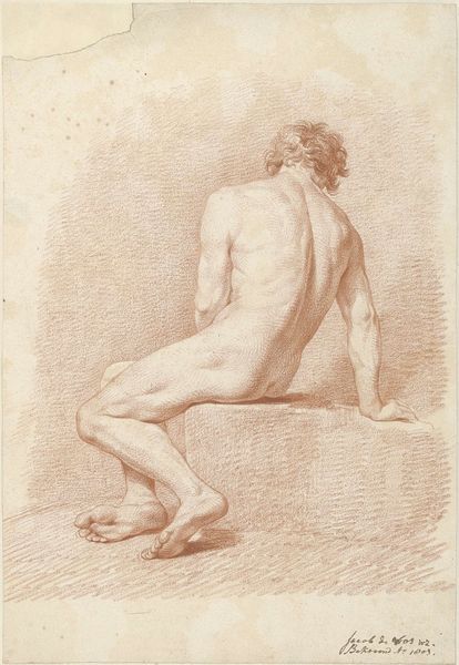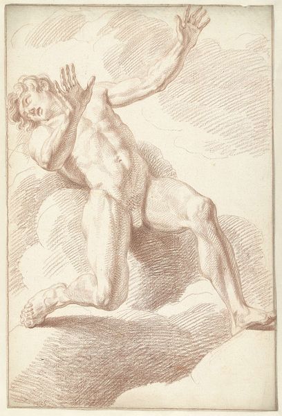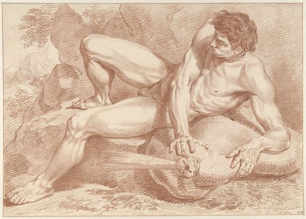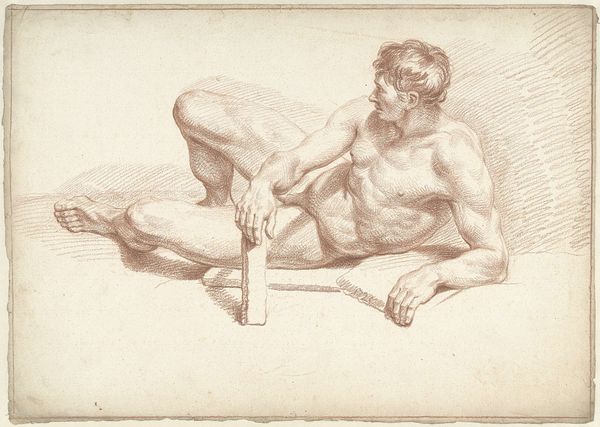 Editor: Here we have Louis Fabritius Dubourg's "Male Nude, Lying on His Side, Resting on His Left Arm" from 1737, rendered in drawing. The subject matter feels very classical. What jumps out at you about this work? Curator: Well, first, it’s important to contextualize its role in the art world. This wasn't intended for public display in the same way as a finished painting. The artist most likely made it as an academic study, used as reference for history paintings or grand mythological scenes. Consider the socio-political implications of representing the male nude at this time; who was commissioning this work and what power did it reflect? Editor: So it’s more like a preparatory study meant for other paintings? That's so interesting! What purpose would this piece fill in Academic Art? Curator: Precisely. It was about mastering form, proportion, and the idealization of the human figure, based on the dominant artistic theories of the academies. Academic art often served the interests of the elite. The perfection in the depiction of human anatomy was very symbolic of social class. Does anything else strike you? Editor: Now that I consider your explanation, the positioning of the man also carries power – looking up as though he is viewing inferiors, for example. Curator: Good observation. Its display within the museum setting impacts the experience. By putting the sketch on the walls, don't you think that shifts its purpose, giving value to what was an instructional reference? Editor: Definitely. It makes you consider the original use as only a piece to creating a final picture, not a finished one itself. I see how our modern museums have changed its reception and place in history. Curator: It's through questioning those shifts in context and audience that we truly understand a piece like this. It allows us to ask not just about what's on display, but *why* it’s on display.