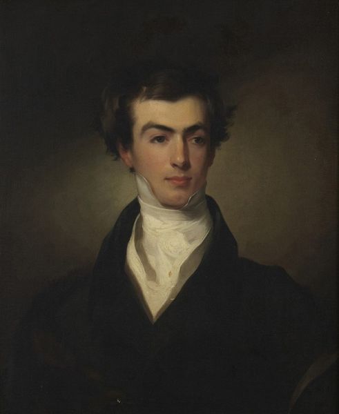 Curator: Here we have a striking example of Romantic portraiture, painted around 1830. It’s simply known as “Portrait of a Man,” the artist unfortunately lost to time. Editor: I feel a quiet confidence radiating from this man, despite the dark background. It makes you wonder what grand thoughts are swirling behind his eyes. And the scale seems…monumental almost, for something so intimate. Curator: Precisely. It's oil on canvas, giving it a rich, almost velvety texture, a hallmark of the period. Notice how the light catches his face, drawing you into his gaze? The unknown artist has really used chiaroscuro to full effect, setting a distinct stage. Editor: That stark contrast emphasizes his thoughtful expression—he's clearly a man of intellect, paperwork in his hand, the pen close by as a promise. Curator: And his pose… it exudes a quiet assurance. The leaning posture, the way he holds his spectacles, all these small signals build a certain image. Editor: But there's something melancholy in the shadows. Almost as though the artist were consciously layering a more complex emotional landscape, despite the trappings of status and class. Curator: Romanticism often played with those contrasts—the ideal versus reality. It can be thought of in this work of having Academic sensibilities combined with an individualized treatment that really seeks an insight into the subject’s character. Editor: It is powerful to have this kind of historical gaze to have such immediacy even across time. It serves as a reminder of individual complexity beyond class status and historical timestamp. Curator: Indeed. An anonymous face, yet one that sparks endless interpretations. It stands as a testament to art's ability to make us connect with the unknown.