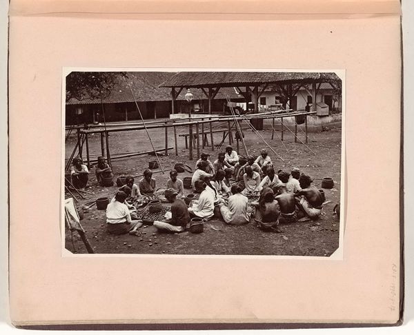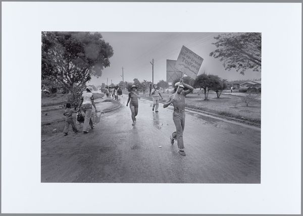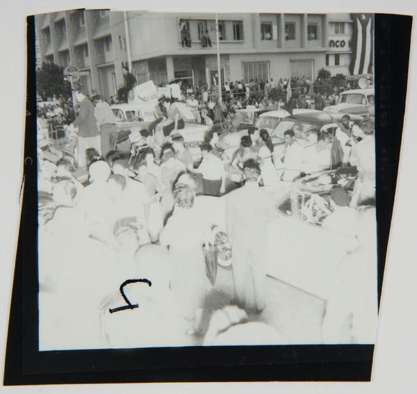 Editor: This is "Untitled (Hawaii)" by Bill Dane. It's a black and white photograph, quite small. The texture of the image is so rich, especially the contrast between the dense foliage and the bright clothing of the crowd. What do you see in the organization of elements here? Curator: Note how Dane employs the formal elements of line and form to create a complex interplay. The horizontal lines of the benches provide a structural base, contrasted with the verticality of the trees. Do you observe how the artist uses light and shadow to direct the eye? Editor: Yes, the way the light filters through the trees creates these patterns that almost obscure the figures, flattening the space. Curator: Precisely. The semiotic significance of this can be debated, but its formal impact is undeniable. This photograph’s composition creates a tension between clarity and obfuscation. Editor: This has given me a lot to think about regarding the artist's compositional choices. Curator: Indeed. It is in this formal tension that the photograph discovers its power.