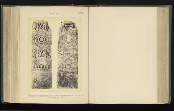 This is a photograph by William H. Griggs of two fragments of pillars. The sepia tones and the texture of the paper give the image a tangible, almost sculptural quality. The pillars themselves are divided into registers, each densely populated with figures and geometric patterns. The composition is strikingly symmetrical, each pillar echoing the other in its arrangement of circular and rectangular forms. The use of concentric circles draws the eye inward, creating focal points that seem to resonate with energy. The high relief carving captures a sense of dynamic movement frozen in stone. These pillars function as a semiotic system, a language encoded in stone. The interplay of geometric shapes and organic figures invites us to decode the cultural narratives embedded within. The act of fragmentation here destabilizes the original context of these pillars, prompting reflections on preservation, interpretation, and the shifting meanings of cultural artifacts. The texture and form ask us to consider how these elements function beyond mere decoration, embodying larger philosophical concerns about time, memory, and representation.