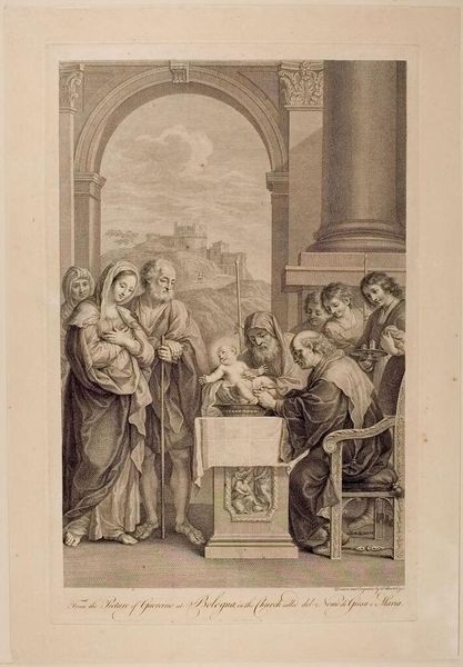 Editor: Here we have Thomas Stothard's "Christ Teaching His Disciples, and Holding a Child." It's quite small, done on paper, presumably a study for something larger? The figures seem very classical, even idealized. What stands out to you about the materials and process used here? Curator: It is the scale, as you noted, and the use of watercolor wash that intrigues me. Mass production of prints in the 18th and 19th centuries popularized biblical scenes, making them newly accessible commodities. How might Stothard's choice of a more "intimate" medium—watercolor, typically associated with amateur or "feminine" art forms— challenge the increasingly commercialized religious imagery of the time? Editor: That's a fascinating point! So, the medium itself becomes a commentary on the industrialization of religious art? Curator: Precisely! It suggests a deliberate move away from mass-produced piety. I wonder, does this small work elevate the importance of the original craft? Editor: It certainly gives me a new appreciation for the artistic labor involved. Thanks! Curator: Indeed. Examining the materiality provides invaluable insight.