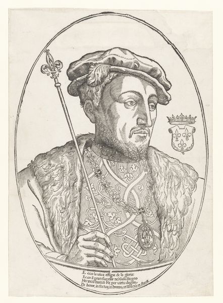Hanns Lautensack created "Oswald von Eck," a striking engraving, now at the Metropolitan Museum, capturing a detailed portrait within a structured composition. The piece is dominated by the sitter's figure, meticulously rendered with fine lines that define textures and forms. Notice the use of geometric shapes; the sphere behind Oswald and the diamond window, which creates a visual counterpoint to the organic curves of the landscape and the sitter himself. This juxtaposition may evoke a sense of balance between the natural world and human intellect. The engraving functions as a sign system, reflecting Renaissance ideals of humanism. The sitter's tools, clothing, and even the landscape can be interpreted as signs of status and intellect. However, the artist uses these elements not merely as symbols of fixed meaning but as components of a larger visual structure that invites ongoing interpretations about identity and representation.