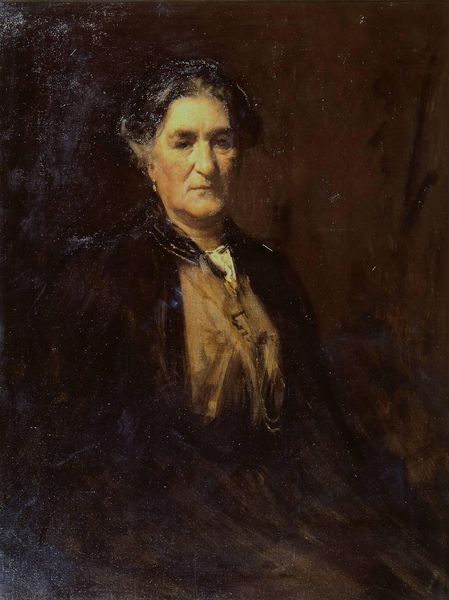 Editor: Here we have Sir John Watson Gordon's portrait of Mrs. George Baird of Strichen. I’m immediately struck by the stark contrast between the dark clothing and the pale face. What stories do you think these visual elements tell? Curator: The black attire is quite telling, isn’t it? Consider the veil, the lace – these aren't merely fashion statements. They're potent symbols of mourning, perhaps widowhood. What emotional associations does the color black evoke for you? Editor: Melancholy, remembrance, and a sense of formality, definitely. Curator: Precisely. The flowers adorning the veil, though delicate, hint at resurrection, a continuity of life. The artist cleverly weaves together sorrow and hope through these symbols. It speaks of the enduring strength of memory. Editor: I never would have picked up on that. It’s like a secret language embedded within the image. Curator: Indeed! These visual motifs tap into shared cultural understandings, echoing across time. We see the echoes of past grief and enduring love.