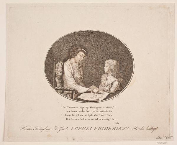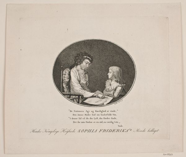 Gerhard Ludvig Lahde created this engraving of Queen Sophia Friderica and her son sometime around the late 18th or early 19th century in Denmark. It's a small image, but it speaks volumes about the cultural values of its time. The composition, framed in a circle, presents an intimate scene of maternal instruction. Look at the way the Queen is guiding her son's education, pointing to words on a page. This isn't just a family portrait; it's a carefully constructed image emphasizing the importance of education, duty, and virtue, all key ideals of the Enlightenment era. Engravings like this circulated widely, shaping public perceptions of the royal family. They presented the monarchy as enlightened and morally upright. Investigating court records, correspondence, and publications from the period help us understand how images like this reinforced social hierarchies and moral values. The true meaning of this artwork lies in understanding its historical and institutional context.