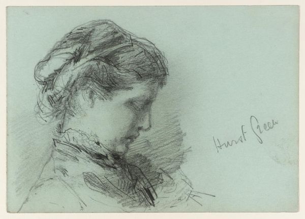 Curator: This sketch immediately evokes a sense of quiet intensity, doesn't it? The monochrome rendering adds to the impression of a moment captured with utmost focus. Editor: Precisely. What we have before us is a portrait drawing entitled "Portrait of N.A. Jaroshenko" executed by Arkhyp Kuindzhi. It appears to be a study done with colored pencils and other dry media on paper. While a precise date isn't available, the style and Kuindzhi's known period suggest the late 19th century. Curator: The use of dry media on paper enhances its dreamlike quality. The subtle blending and visible strokes create a soft but distinct contrast. Notice the sitter’s gaze; it holds a deep sense of introspection. Editor: Kuindzhi's choice to render Jaroshenko in profile presents her as a figure of intellect and perhaps even of stoicism. There's a deliberate avoidance of direct engagement with the viewer, suggesting a desire to protect inner thoughts. Who was she in relation to the artist? Was this portrait a formal commission or an intimate gesture of friendship? Curator: That's the intriguing thing about portraits, especially from this era, isn’t it? Jaroshenko’s downcast gaze evokes classical sculptures and coins with similar side views, elevating her status through familiar associations. It’s worth reflecting how the artist elevates their subjects in their visual representations, and what those visual tropes meant at the time. Editor: The absence of adornment concentrates our attention on her facial features, the lines of her neck and jaw. Yet this lack of specific detail paradoxically tells a wider story – hinting at perhaps modesty and restraint prized at the time. Curator: Looking closely at her tightly restrained hair, I can’t help but think about similar Victorian images of quiet women in mourning. Hair has always symbolized cultural identities. Considering its particular darkness, the work gains even deeper levels of association and reflection, inviting meditation about the role and position of the model in Kuindzhi’s life, his art, and, in the grander scheme, about gendered representation. Editor: It definitely speaks to how representations, be they sculptures or portrait drawings like this one, construct public personas with underlying personal narratives, whether intentional or implied by social context. Thank you. This encounter allows one to see how history, even in sketches, has deeply layered symbolism. Curator: Indeed, a brief but suggestive snapshot of time, a moment translated with remarkable sensitivity, as only skilled renderings on paper can achieve.