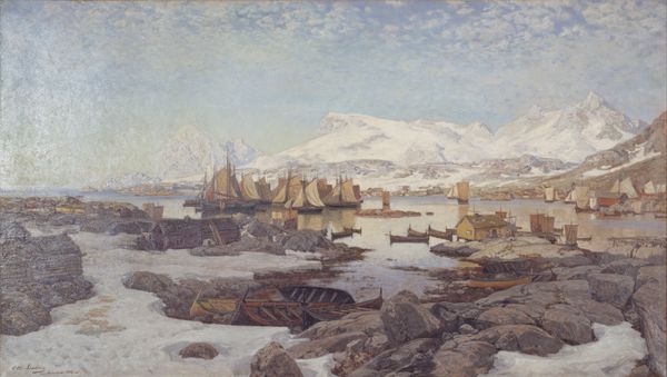 Curator: Look at this serene depiction of the North Norwegian coast. Anna Katarina Boberg, though the artwork isn't specifically dated, painted "Fishing Harbour with Sunlit Mountains" using oil paint, currently held at the Nationalmuseum in Stockholm. Editor: Wow, that sky! It's almost… bruised. Like a fading sunset echoing in icy water. You can practically feel the cold just looking at it, right? It's bleak, but kind of beautiful, like a melancholic poem. Curator: Exactly! Boberg's work, often placed within the framework of Naturalism, reflects a movement fascinated by the socio-political conditions and environments of its time, often underscoring labor, class, and our relation to nature. The portrayal here, with the bustling harbor beneath formidable, untouched mountains, raises interesting dialogues. What lives and industries are carved out against seemingly indifferent majestic landscapes? Editor: Hmmm. Makes you think about human impact, even then. Like, the fishing industry… supporting lives but also disturbing a pristine wilderness. But those little boats nestled in the harbor – they give the mountains scale and a strange kind of coziness too. Do you think the artist intentionally gave such imposing mountains the warmth from this orange light? Curator: It's plausible. The warm light offsets the almost monochromatic use of blue and white, inviting us to find humanity within nature’s scale. Boberg was a prominent artist; considering her contemporary climate of evolving social democracy in Scandinavia, it might not be an accident her artistic endeavors underscored these connections between humanity and landscape. It invites reflection about resource access, land, and labor ethics that persist to today. Editor: You know, now that I am looking closer, this composition is subtly unnerving. I can see a real blend of the ethereal and the tangible – maybe reflecting the very anxieties of encroaching "progress?" Makes you feel something, which is what matters, doesn't it? Curator: Precisely, it reveals tensions within modernity's reach. Considering how crucial fishing remains in that region even today—sustaining not only economies but the culture and identities deeply entwined within coastal areas—understanding representations like these within their appropriate contexts becomes particularly insightful. Editor: Food for thought, that’s for sure. I might go get some seafood for dinner tonight!