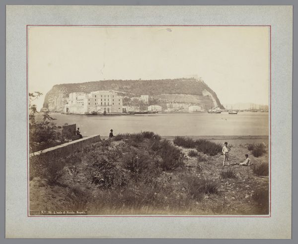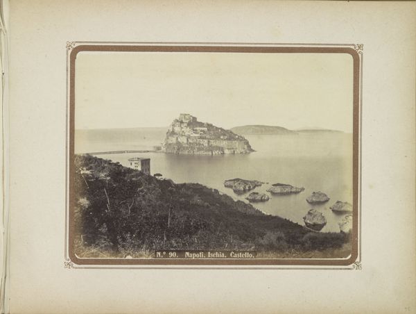 Curator: This is "Gezicht op het eiland Nisida in de golf van Napels, Italië," a captivating albumen print created sometime between 1857 and 1914, part of the Rijksmuseum's collection. What strikes you most when you first see it? Editor: Oh, that moody light! It's as if a memory, a hazy, antique vision is laid out before me. I'm getting a pensive feeling, like stepping back in time on a still, silent day. Curator: Absolutely, and the albumen process contributes so much to that feel. We can see in the tonal range, how the artist, Giorgio Sommer, uses chemistry to control depth, the way highlights pop against shadows that help make the land seem monumental. The sharp lines give way to muted tones as we move farther out to sea. It also showcases the expansion of photographic reproduction and dissemination. Editor: The road snaking up that cliff-face makes me wonder who was doing the building. Were they happy about it? How many lives were altered? How did their tools function, the means to produce such changes? One imagines the laborious work on-site and in studio processing these massive images in dangerous chemicals, not for 'art' exactly, but something that became that. Curator: Those are keen observations. Certainly, this landscape speaks of changing infrastructure of the nineteenth century as well as its visual culture. Consider also that Sommer operated a successful studio catering to tourists eager for views like this—images documenting their travels and experiences, reproduced by the score! What kind of materials are used for preservation? How does this photo come down to us in the digital space? What effect is made to see a vintage print in an era defined by digital imagery? Editor: Seeing it now, filtered through screens, there's an additional layer of temporal remove. I’m taken with the tension in the photo; there's so much nature and agriculture represented along with industry on that distant shore. One cannot visit without causing an effect. Curator: A delicate dance between nature and culture, perfectly captured through early photographic technology... A prescient comment, perhaps, for our own time! Editor: Precisely! So much in a single, layered, evocative photograph.